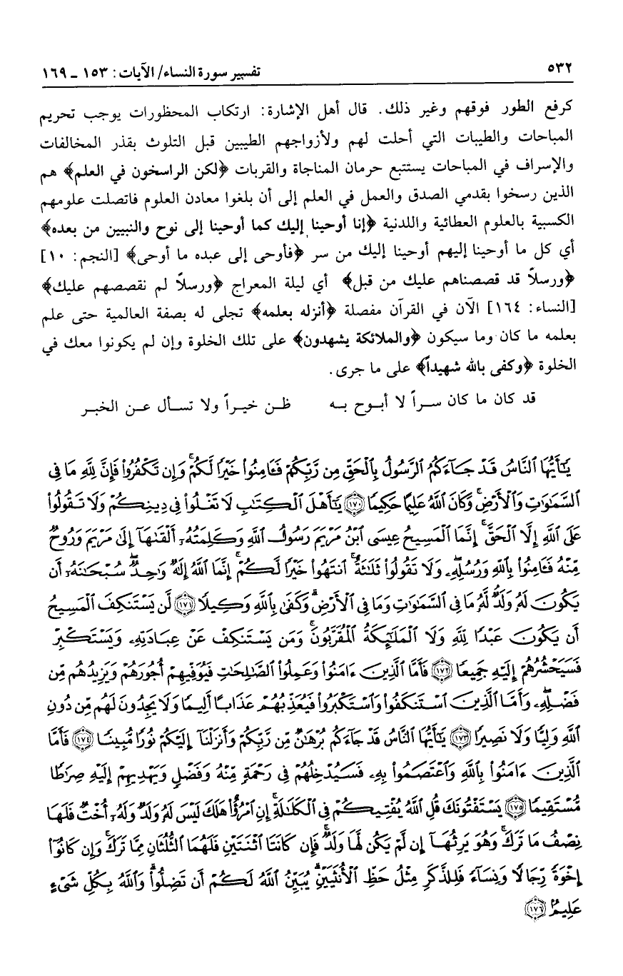 [النجم: 10] وَرُسُلًا قَدْ قَصَصْناهُمْ عَلَيْكَ مِنْ قَبْلُ أي ليلة المعراج وَرُسُلًا لَمْ نَقْصُصْهُمْ عَلَيْكَ [النساء: 164] الآن في القرآن مفصلة أَنْزَلَهُ بِعِلْمِهِ تجلى له بصفة العالمية حتى علم بعلمه ما كان وما سيكون وَالْمَلائِكَةُ يَشْهَدُونَ على تلك الخلوة وإن لم يكونوا معك في الخلوة وَكَفى بِاللَّهِ شَهِيداً على ما جرى.