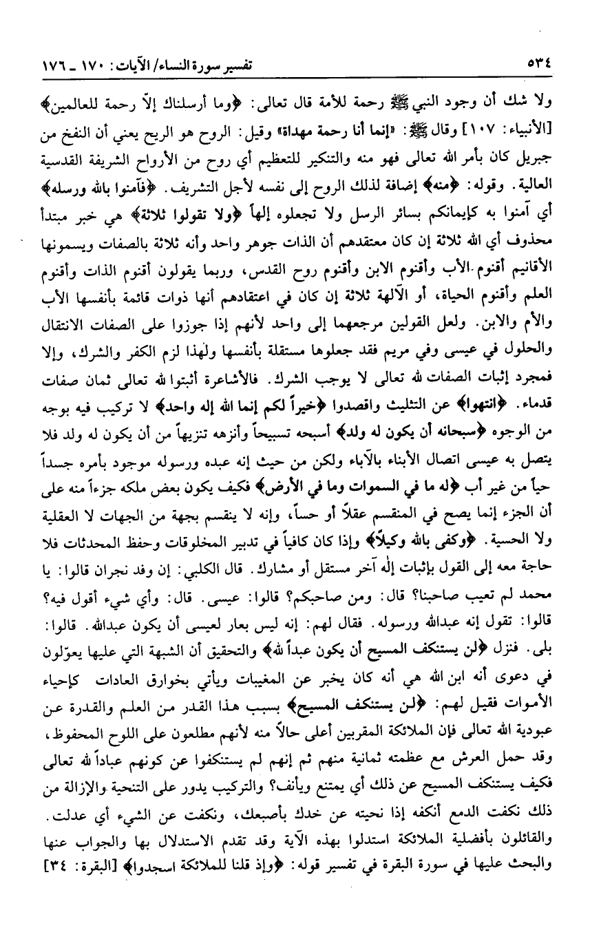 وقيل: الروح هو الريح يعني أن النفخ من جبريل كان بأمر الله تعالى فهو منه والتنكير للتعظيم أي روح من الأرواح الشريفة القدسية العالية. وقوله: مِنْهُ إضافة لذلك الروح إلى نفسه لأجل التشريف. فَآمِنُوا بِاللَّهِ وَرُسُلِهِ أي آمنوا به كإيمانكم بسائر الرسل ولا تجعلوه إلها وَلا تَقُولُوا ثَلاثَةٌ هي خبر مبتدأ محذوف أي الله ثلاثة إن كان معتقدهم أن الذات جوهر واحد وأنه ثلاثة بالصفات ويسمونها الأقانيم أقنوم الأب وأقنوم الابن وأقنوم روح القدس، وربما يقولون أقنوم الذات وأقنوم العلم وأقنوم الحياة، أو الآلهة ثلاثة إن كان في اعتقادهم أنها ذوات قائمة بأنفسها الأب والأم والابن. ولعل القولين مرجعهما إلى واحد لأنهم إذا جوزوا على الصفات الانتقال والحلول في عيسى وفي مريم فقد جعلوها مستقلة بأنفسها ولهذا لزم الكفر والشرك، وإلا فمجرد إثبات الصفات لله تعالى لا يوجب الشرك. فالأشاعرة أثبتوا لله تعالى ثمان صفات قدماء. انْتَهُوا عن التثليث واقصدوا خَيْراً لَكُمْ إِنَّمَا اللَّهُ إِلهٌ واحِدٌ لا تركيب فيه بوجه من الوجوه سُبْحانَهُ أَنْ يَكُونَ لَهُ وَلَدٌ أسبحه تسبيحا وأنزهه تنزيها من أن يكون له ولد فلا يتصل به عيسى اتصال الأبناء بالآباء ولكن من حيث إنه عبده ورسوله موجود بأمره جسدا حيا من غير أب لَهُ ما فِي السَّماواتِ وَما فِي الْأَرْضِ فكيف يكون بعض ملكه جزءا منه على أن الجزء إنما يصح في المنقسم عقلا أو حسا، وإنه لا ينقسم بجهة من الجهات لا العقلية ولا الحسية. وَكَفى بِاللَّهِ وَكِيلًا وإذا كان كافيا في تدبير المخلوقات وحفظ المحدثات فلا حاجة معه إلى القول بإثبات إله آخر مستقل أو مشارك.