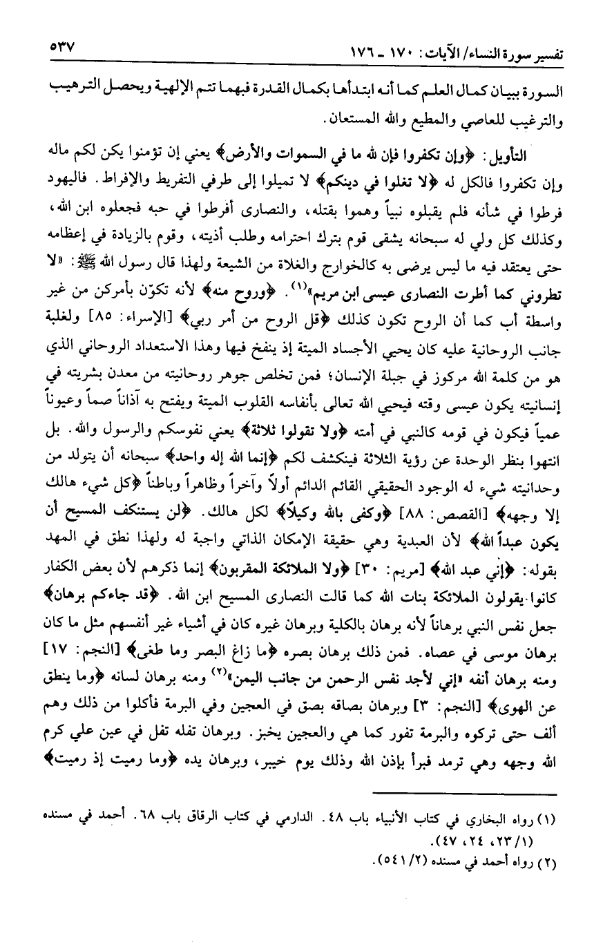 وَإِنْ تَكْفُرُوا فَإِنَّ لِلَّهِ ما فِي السَّماواتِ وَالْأَرْضِ يعني إن تؤمنوا يكن لكم ماله وإن تكفروا فالكل له لا تَغْلُوا فِي دِينِكُمْ لا تميلوا إلى طرفي التفريط والإفراط. فاليهود فرطوا في شأنه فلم يقبلوه نبيا وهموا بقتله، والنصارى أفرطوا في حبه فجعلوه ابن الله، وكذلك كل ولي له سبحانه يشقى قوم بترك احترامه وطلب أذيته، وقوم بالزيادة في إعظامه حتى يعتقد فيه ما ليس يرضى به كالخوارج والغلاة من الشيعة ولهذا