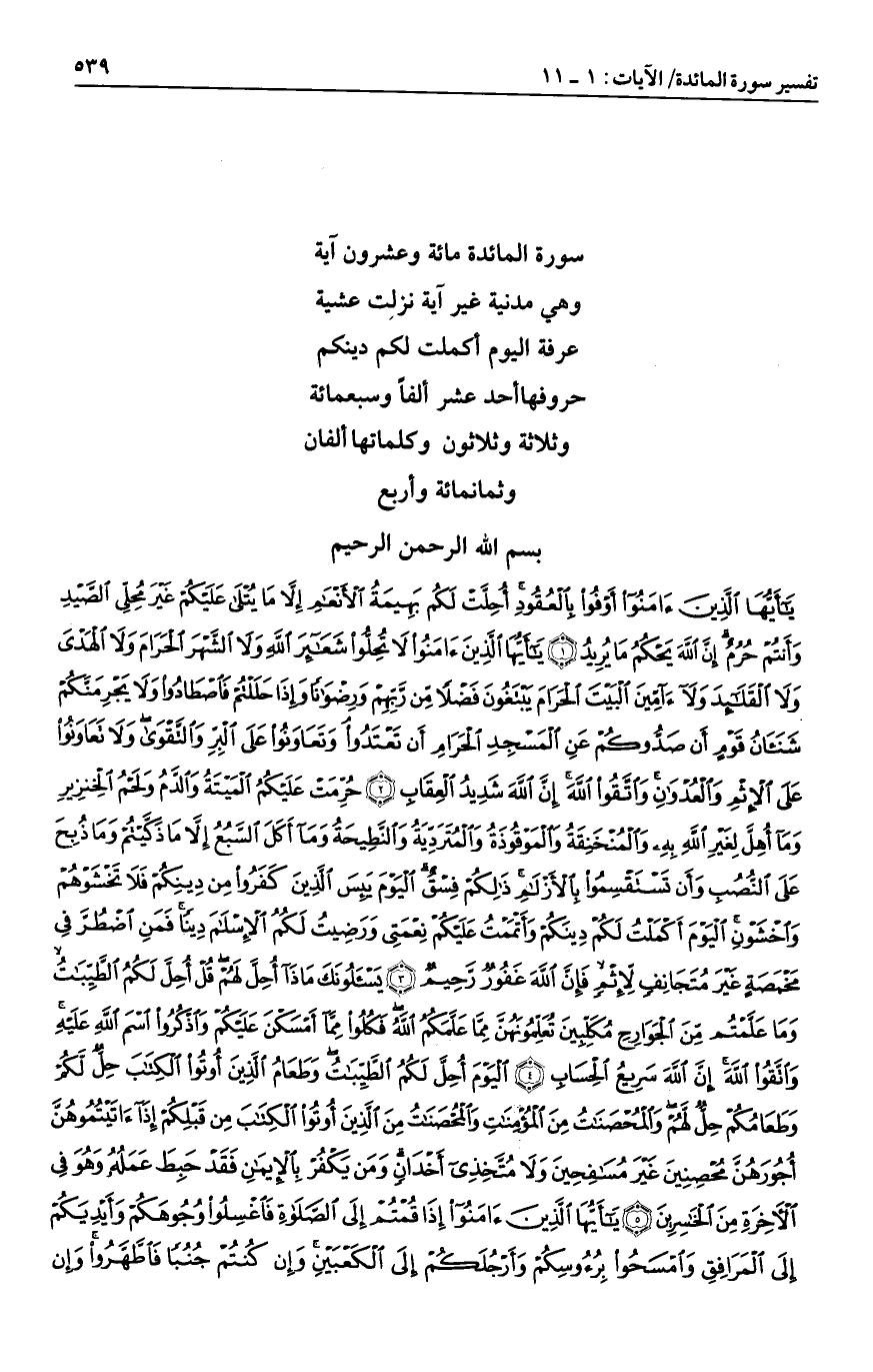 يا أَيُّهَا الَّذِينَ آمَنُوا أَوْفُوا بِالْعُقُودِ أُحِلَّتْ لَكُمْ بَهِيمَةُ الْأَنْعامِ إِلاَّ ما يُتْلى عَلَيْكُمْ غَيْرَ مُحِلِّي الصَّيْدِ وَأَنْتُمْ حُرُمٌ إِنَّ اللَّهَ يَحْكُمُ ما يُرِيدُ (1) يا أَيُّهَا الَّذِينَ آمَنُوا لا تُحِلُّوا شَعائِرَ اللَّهِ وَلا الشَّهْرَ الْحَرامَ وَلا الْهَدْيَ وَلا الْقَلائِدَ وَلا آمِّينَ الْبَيْتَ الْحَرامَ يَبْتَغُونَ فَضْلاً مِنْ رَبِّهِمْ وَرِضْواناً وَإِذا حَلَلْتُمْ فَاصْطادُوا وَلا يَجْرِمَنَّكُمْ شَنَآنُ قَوْمٍ أَنْ صَدُّوكُمْ عَنِ الْمَسْجِدِ الْحَرامِ أَنْ تَعْتَدُوا وَتَعاوَنُوا عَلَى الْبِرِّ وَالتَّقْوى وَلا تَعاوَنُوا عَلَى الْإِثْمِ وَالْعُدْوانِ وَاتَّقُوا اللَّهَ إِنَّ اللَّهَ شَدِيدُ الْعِقابِ (2) حُرِّمَتْ عَلَيْكُمُ الْمَيْتَةُ وَالدَّمُ وَلَحْمُ الْخِنْزِيرِ وَما أُهِلَّ لِغَيْرِ اللَّهِ بِهِ وَالْمُنْخَنِقَةُ وَالْمَوْقُوذَةُ وَالْمُتَرَدِّيَةُ وَالنَّطِيحَةُ وَما أَكَلَ السَّبُعُ إِلاَّ ما ذَكَّيْتُمْ وَما ذُبِحَ عَلَى النُّصُبِ وَأَنْ تَسْتَقْسِمُوا بِالْأَزْلامِ ذلِكُمْ فِسْقٌ الْيَوْمَ يَئِسَ الَّذِينَ كَفَرُوا مِنْ دِينِكُمْ فَلا تَخْشَوْهُمْ وَاخْشَوْنِ الْيَوْمَ أَكْمَلْتُ لَكُمْ دِينَكُمْ وَأَتْمَمْتُ عَلَيْكُمْ نِعْمَتِي وَرَضِيتُ لَكُمُ الْإِسْلامَ دِيناً فَمَنِ اضْطُرَّ فِي مَخْمَصَةٍ غَيْرَ مُتَجانِفٍ لِإِثْمٍ فَإِنَّ اللَّهَ غَفُورٌ رَحِيمٌ (3) يَسْئَلُونَكَ ماذا أُحِلَّ لَهُمْ قُلْ أُحِلَّ لَكُمُ الطَّيِّباتُ وَما عَلَّمْتُمْ مِنَ الْجَوارِحِ مُكَلِّبِينَ تُعَلِّمُونَهُنَّ مِمَّا عَلَّمَكُمُ اللَّهُ فَكُلُوا مِمَّا أَمْسَكْنَ عَلَيْكُمْ وَاذْكُرُوا اسْمَ اللَّهِ عَلَيْهِ وَاتَّقُوا اللَّهَ إِنَّ اللَّهَ سَرِيعُ الْحِسابِ (4)