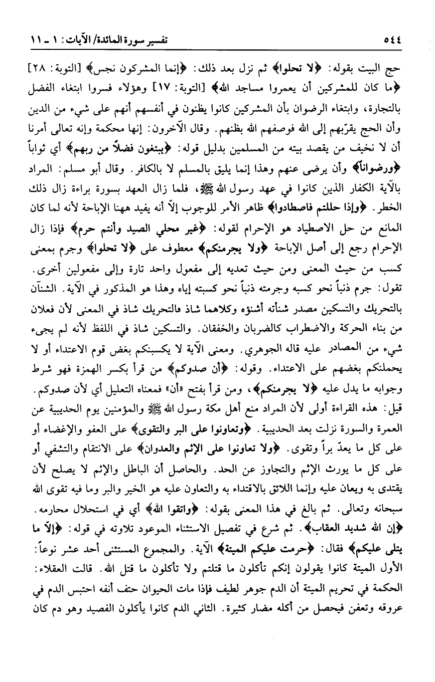 حج البيت بقوله: لا تُحِلُّوا ثم نزل بعد ذلك: إِنَّمَا الْمُشْرِكُونَ نَجَسٌ [التوبة: 28] ما كانَ لِلْمُشْرِكِينَ أَنْ يَعْمُرُوا مَساجِدَ اللَّهِ [التوبة: 17] وهؤلاء فسروا ابتغاء الفضل بالتجارة، وابتغاء الرضوان بأن المشركين كانوا يظنون في أنفسهم أنهم على شيء من الدين وأن الحج يقرّبهم إلى الله فوصفهم الله بظنهم. وقال الآخرون: إنها محكمة وإنه تعالى أمرنا أن لا نخيف من يقصد بيته من المسلمين بدليل قوله: يَبْتَغُونَ فَضْلًا مِنْ رَبِّهِمْ أي ثوابا وَرِضْواناً وأن يرضى عنهم وهذا إنما يليق بالمسلم لا بالكافر. وقال أبو مسلم: المراد بالآية الكفار الذين كانوا في عهد رسول الله صلى الله عليه وسلم، فلما زال العهد بسورة براءة زال ذلك الخطر. وَإِذا حَلَلْتُمْ فَاصْطادُوا ظاهر الأمر للوجوب إلّا أنه يفيد هاهنا الإباحة لأنه لما كان المانع من حل الاصطياد هو الإحرام لقوله: غَيْرَ مُحِلِّي الصَّيْدِ وَأَنْتُمْ حُرُمٌ فإذا زال الإحرام رجع إلى أصل الإباحة وَلا يَجْرِمَنَّكُمْ معطوف على لا تُحِلُّوا وجرم بمعنى كسب من حيث المعنى ومن حيث تعديه إلى مفعول واحد تارة وإلى مفعولين أخرى.