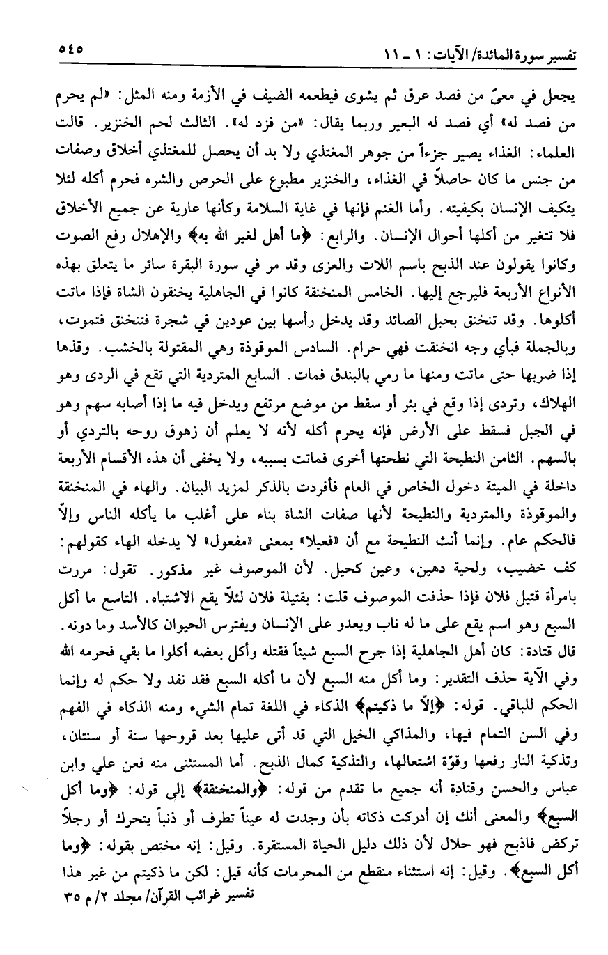 يجعل في معىّ من فصد عرق ثم يشوى فيطعمه الضيف في الأزمة ومنه المثل: «لم يحرم من فصد له» أي فصد له البعير وربما يقال: «من فزد له» . الثالث لحم الخنزير. قالت العلماء: الغذاء يصير جزءا من جوهر المغتذي ولا بد أن يحصل للمغتذي أخلاق وصفات من جنس ما كان حاصلا في الغذاء، والخنزير مطبوع على الحرص والشره فحرم أكله لئلا يتكيف الإنسان بكيفيته. وأما الغنم فإنها في غاية السلامة وكأنها عارية عن جميع الأخلاق فلا تتغير من أكلها أحوال الإنسان. والرابع: ما أُهِلَّ لِغَيْرِ اللَّهِ بِهِ والإهلال رفع الصوت وكانوا يقولون عند الذبح باسم اللات والعزى وقد مر في سورة البقرة سائر ما يتعلق بهذه الأنواع الأربعة فليرجع إليها. الخامس المنخنقة كانوا في الجاهلية يخنقون الشاة فإذا ماتت أكلوها. وقد تنخنق بحبل الصائد وقد يدخل رأسها بين عودين في شجرة فتنخنق فتموت، وبالجملة فبأي وجه انخنقت فهي حرام. السادس الموقوذة وهي المقتولة بالخشب. وقذها إذا ضربها حتى ماتت ومنها ما رمي بالبندق فمات. السابع المتردية التي تقع في الردى وهو الهلاك، وتردى إذا وقع في بئر أو سقط من موضع مرتفع ويدخل فيه ما إذا أصابه سهم وهو في الجبل فسقط على الأرض فإنه يحرم أكله لأنه لا يعلم أن زهوق روحه بالتردي أو بالسهم. الثامن النطيحة التي نطحتها أخرى فماتت بسببه، ولا يخفى أن هذه الأقسام الأربعة داخلة في الميتة دخول الخاص في العام فأفردت بالذكر لمزيد البيان. والهاء في المنخنقة والموقوذة والمتردية والنطيحة لأنها صفات الشاة بناء على أغلب ما يأكله الناس وإلّا فالحكم عام. وإنما أنث النطيحة مع أن «فعيلا» بمعنى «مفعول» لا يدخله الهاء كقولهم: