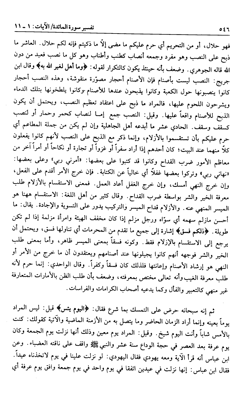فهو حلال، أو من التحريم أي حرم عليكم ما مضى إلّا ما ذكيتم فإنه لكم حلال. العاشر ما ذبح على النصب وهو مفرد وجمعه أنصاب كطنب وأطناب وهو كل ما نصب فعبد من دون الله قاله الجوهري. وضعف بأنه حينئذ يكون كالتكرار لقوله: وَما أُهِلَّ لِغَيْرِ اللَّهِ بِهِ وقال ابن جريج: النصب ليست بأصنام فإن الأصنام أحجار مصوّرة منقوشة، وهذه النصب أحجار كانوا ينصبونها حول الكعبة وكانوا يذبحون عندها للأصنام وكانوا يلطخونها بتلك الدماء ويشرحون اللحوم عليها، فالمراد ما ذبح على اعتقاد تعظيم النصب، ويحتمل أن يكون الذبح للأصنام واقعا عليها. وقيل: النصب جمع إما لنصاب كحمر وحمار أو لنصب كسقف وسقف. الحادي عشر ما أبدعه أهل الجاهلية وإن لم يكن من جملة المطاعم أي حرم عليكم بأن تستقسموا بالأزلام، وإنما ذكر مع الذبح على النصب لأنهم كانوا يفعلون كلا منهما عند البيت كان أحدهم إذا أراد سفرا أو غزوا أو تجارة أو نكاحا أو أمرا آخر من معاظم الأمور ضرب القداح وكانوا قد كتبوا على بعضها: «أمرني ربي» وعلى بعضها: