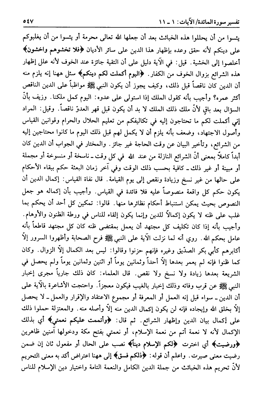 يئسوا من أن يحللوا هذه الخبائث بعد أن جعلها الله تعالى محرمة أو يئسوا من أن يغلبوكم على دينكم لأنه حقق وعده بإظهار هذا الدين على سائر الأديان فَلا تَخْشَوْهُمْ وَاخْشَوْنِ أخلصوا إلى الخشية. قيل: في الآية دليل على أن التقية جائزة عند الخوف لأنه علل إظهار هذه الشرائع بزوال الخوف من الكفار. الْيَوْمَ أَكْمَلْتُ لَكُمْ دِينَكُمْ سئل هاهنا إنه يلزم منه أن الدين كان ناقصا قبل ذلك، وكيف يجوز أن يكون النبي صلى الله عليه وسلم مواظبا على الدين الناقص أكثر عمره؟ وأجيب بأنه كقول الملك إذا استولى على عدوه: اليوم كمل ملكنا. وزيف بأنّ السؤال بعد باق لأنّ ملك ذلك الملك لا بد أن يكون قبل قهر العدوّ ناقصا. وقيل: المراد إني أكملت لكم ما تحتاجون إليه في تكاليفكم من تعليم الحلال والحرام وقوانين القياس وأصول الاجتهاد، وضعف بأنه يلزم أن لا يكمل لهم قبل ذلك اليوم ما كانوا محتاجين إليه من الشرائع، وتأخير البيان عن وقت الحاجة غير جائز. والمختار في الجواب أن الدين كان أبدا كاملا بمعنى أنّ الشرائع النازلة من عند الله في كل وقت- ناسخة أو منسوخة أو مجملة أو مبينة أو غير ذلك- كافية بحسب ذلك الوقت وفي آخر زمان البعثة حكم ببقاء الأحكام على حالها من غير نسخ وزيادة ونقص إلى يوم القيامة. قال نفاة القياس: إكمال الدين أن يكون حكم كل واقعة منصوصا عليه فلا فائدة في القياس. وأجيب بأن إكماله هو جعل النصوص بحيث يمكن استنباط أحكام نظائرها منها. قالوا: تمكين كل أحد أن يحكم بما غلب على ظنه لا يكون إكمالا للدين وإنما يكون إلقاء للناس في ورطة الظنون والأوهام.