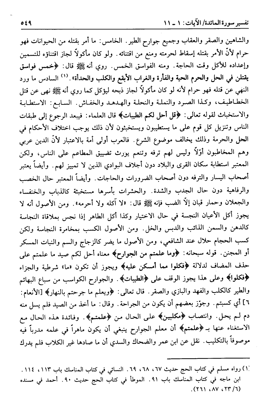 ومن الأصول أنه لا يجوز أكل الأعيان النجسة في حال الاختيار وكذا أكل الطاهر إذا نجس بملاقاة النجاسة كالدهن والسمن الذائب والدبس والخل. ومن الأصول الكسب بمخامرة النجاسة ولكن كسب الحجام حلال عند الشافعي، ومن الأصول ما يضر كالزجاج والسم والنبات المسكر أو المجنن. قوله سبحانه: وَما عَلَّمْتُمْ مِنَ الْجَوارِحِ معناه أحل لكم صيد ما علمتم على حذف المضاف لدلالة فَكُلُوا مِمَّا أَمْسَكْنَ عَلَيْكُمْ ويجوز أن تكون «ما» شرطية والجزاء فَكُلُوا وعلى هذا يجوز الوقف على الطَّيِّباتُ. والجوارح الكواسب من سباع البهائم والطير كالكلب والفهد والبازي والصقر. قال تعالى: وَيَعْلَمُ ما جَرَحْتُمْ بِالنَّهارِ [الأنعام: