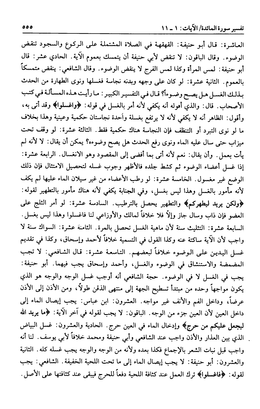 العاشرة: قال أبو حنيفة: القهقهة في الصلاة المشتملة على الركوع والسجود تنقض الوضوء. وقال الباقون: لا تنقض لأبي حنيفة أن يتمسك بعموم الآية. الحادي عشر: قال أبو حنيفة: لمس المرأة وكذا لمس الفرج لا ينقض الوضوء. وقال الشافعي: ينقض متمسكا بالعموم. الثانية عشرة: لو كان على وجهه وبدنه نجاسة فغسلها ونوى الطهارة من الحدث بذلك الغسل هل يصح وضوءا؟ قال في التفسير الكبير: ما رأيت هذه المسألة في كتب الأصحاب. قال: والذي أقوله أنه يكفي لأنه أمر بالغسل في قوله: فَاغْسِلُوا وقد أتى به، وأقول: الظاهر أنه لا يكفي لأنه لا يرتفع بغسلة واحدة نجاستان حكمية وعينية وهذا بخلاف ما لو نوى التبرد أو التنظف فإن النجاسة هناك حكمية فقط. الثالثة عشرة: لو وقف تحت ميزاب حتى سال عليه الماء ونوى رفع الحدث هل يصح وضوءه؟ يمكن أن يقال: لا لأنه لم يأت بعمل. وأن يقال: نعم لأنه أتى بما أفضى إلى المقصود وهو الانغسال. الرابعة عشرة: