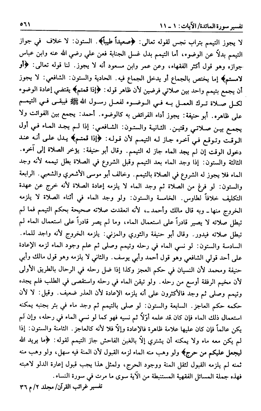 السادسة والستون: لو نسي الماء في رحله وتيمم وصلى ثم علم وجود الماء لزمه الإعادة على أحد قولي الشافعي وهو قول أحمد وأبي يوسف. والثاني لا يلزمه وهو قول مالك وأبي حنيفة ومحمد لأن النسيان في حكم العجز وكذا إذا ضل رحله في الرحال بالطريق الأولى لأن مخيم الرفقة أوسع من رحله. ولو تيقن الماء في رحله واستقصى في الطلب فلم يجده وتيمم وصلى ثم وجد فالأكثرون على أنه يلزمه الإعادة لأن العذر ضعيف. وقيل: لا لأن حكمه حكم العاجز. السابعة والستون: لو صلى بالتيمم ثم وجد ماء في بئر بجنبه يمكنه استعمال ذلك الماء فإن كان قد علمه أوّلا ثم نسيه فهو كما لو نسي الماء في رحله، وإن لم يكن عالما فإن كان عليها علامة ظاهرة فالإعادة وإلّا فلا لأنه كالعاجز. الثامنة والستون: إذا لم يكن معه ماء ولا يمكنه أن يشتري إلّا بالغبن الفاحش جاز التيمم لقوله: ما يُرِيدُ اللَّهُ لِيَجْعَلَ عَلَيْكُمْ مِنْ حَرَجٍ ولو وهب منه الماء لزمه القبول لأن المنة فيه سهل، ولو وهب منه ثمنه لم يلزمه القبول لثقل المنة ووجود الحرج، ولمثل هذا يجب قبول إعارة الدلو لاهبته فهذه جملة المسائل الفقهية المستنبطة من الآية سوى ما مرت في سورة النساء.