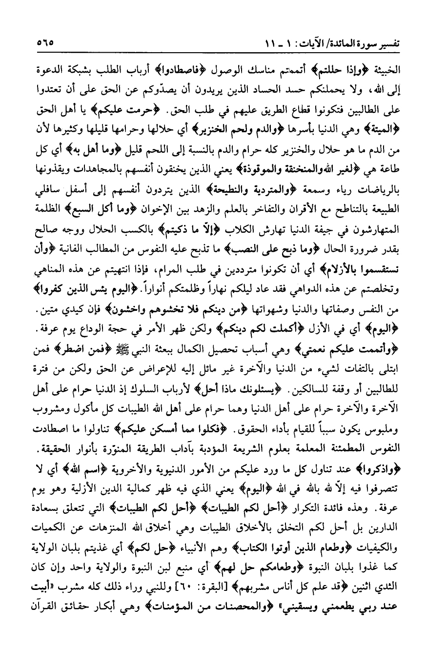 الخبيثة وَإِذا حَلَلْتُمْ أتممتم مناسك الوصول فَاصْطادُوا أرباب الطلب بشبكة الدعوة إلى الله، ولا يحملنكم حسد الحساد الذين يريدون أن يصدّوكم عن الحق على أن تعتدوا على الطالبين فتكونوا قطاع الطريق عليهم في طلب الحق. حُرِّمَتْ عَلَيْكُمُ يا أهل الحق الْمَيْتَةُ وهي الدنيا بأسرها وَالدَّمُ وَلَحْمُ الْخِنْزِيرِ أي حلالها وحرامها قليلها وكثيرها لأن من الدم ما هو حلال والخنزير كله حرام والدم بالنسبة إلى اللحم قليل وَما أُهِلَّ بِهِ أي كل طاعة هي لِغَيْرِ اللَّهِ بِهِ وَالْمُنْخَنِقَةُ وَالْمَوْقُوذَةُ يعني الذين يخنقون أنفسهم بالمجاهدات ويقذونها بالرياضات رياء وسمعة وَالْمُتَرَدِّيَةُ وَالنَّطِيحَةُ الذين يتردون أنفسهم إلى أسفل سافلي الطبيعة بالتناطح مع الأقران والتفاخر بالعلم والزهد بين الإخوان وَما أَكَلَ السَّبُعُ الظلمة المتهارشون في جيفة الدنيا تهارش الكلاب إِلَّا ما ذَكَّيْتُمْ بالكسب الحلال ووجه صالح بقدر ضرورة الحال وَما ذُبِحَ عَلَى النُّصُبِ ما تذبح عليه النفوس من المطالب الفانية وَأَنْ تَسْتَقْسِمُوا بِالْأَزْلامِ أي أن تكونوا مترددين في طلب المرام، فإذا انتهيتم عن هذه المناهي وتخلصتم عن هذه الدواهي فقد عاد ليلكم نهارا وظلمتكم أنوارا. الْيَوْمَ يَئِسَ الَّذِينَ كَفَرُوا من النفس وصفاتها والدنيا وشهواتها مِنْ دِينِكُمْ فَلا تَخْشَوْهُمْ وَاخْشَوْنِ فإن كيدي متين.