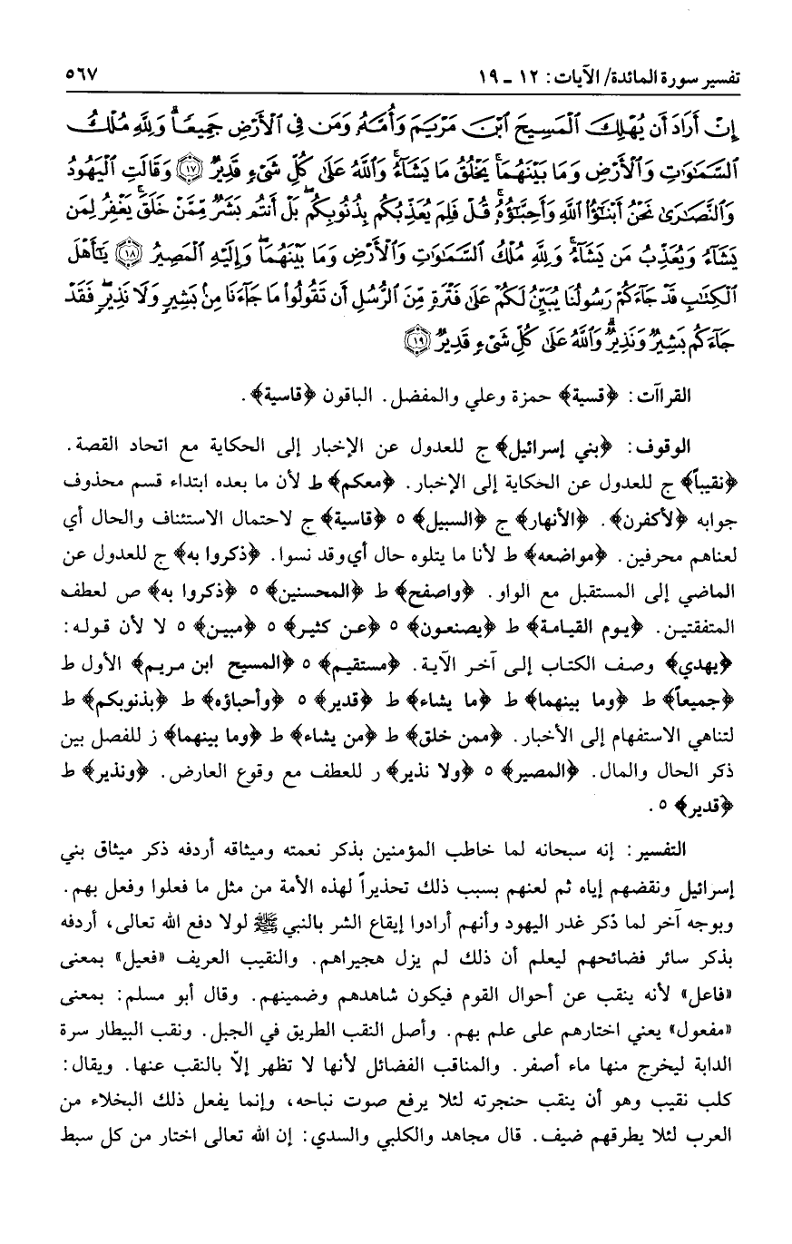 يَهْدِي وصف الكتاب إلى آخر الآية. مُسْتَقِيمٍ هـ الْمَسِيحُ ابْنُ مَرْيَمَ الأول ط جَمِيعاً ط وَما بَيْنَهُما ط ما يَشاءُ ط قَدِيرٌ هـ وَأَحِبَّاؤُهُ ط بِذُنُوبِكُمْ ط لتناهي الاستفهام إلى الأخبار. مِمَّنْ خَلَقَ ط مَنْ يَشاءُ ط وَما بَيْنَهُما ز للفصل بين ذكر الحال والمال. الْمَصِيرُ هـ وَلا نَذِيرٍ ر للعطف مع وقوع العارض. وَنَذِيرٌ ط قَدِيرٌ هـ.