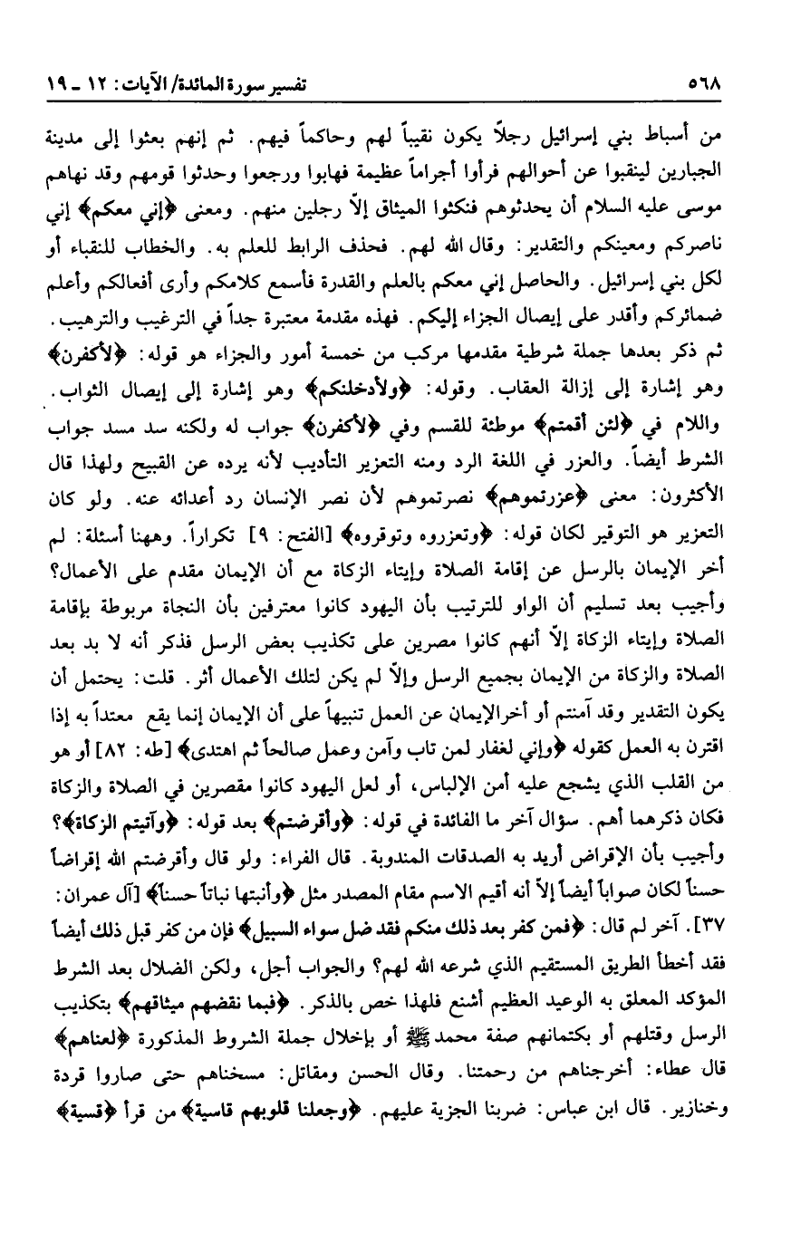 وأجيب بعد تسليم أن الواو للترتيب بأن اليهود كانوا معترفين بأن النجاة مربوطة بإقامة الصلاة وإيتاء الزكاة إلّا أنهم كانوا مصرين على تكذيب بعض الرسل فذكر أنه لا بد بعد الصلاة والزكاة من الإيمان بجميع الرسل وإلّا لم يكن لتلك الأعمال أثر. قلت: يحتمل أن يكون التقدير وقد آمنتم أو أخر الإيمان عن العمل تنبيها على أن الإيمان إنما يقع معتدا به إذا اقترن به العمل كقوله وَإِنِّي لَغَفَّارٌ لِمَنْ تابَ وَآمَنَ وَعَمِلَ صالِحاً ثُمَّ اهْتَدى [طه: 82] أو هو من القلب الذي يشجع عليه أمن الإلباس، أو لعل اليهود كانوا مقصرين في الصلاة والزكاة فكان ذكرهما أهم. سؤال آخر ما الفائدة في قوله: وَأَقْرَضْتُمُ بعد قوله: وَآتَيْتُمُ الزَّكاةَ؟