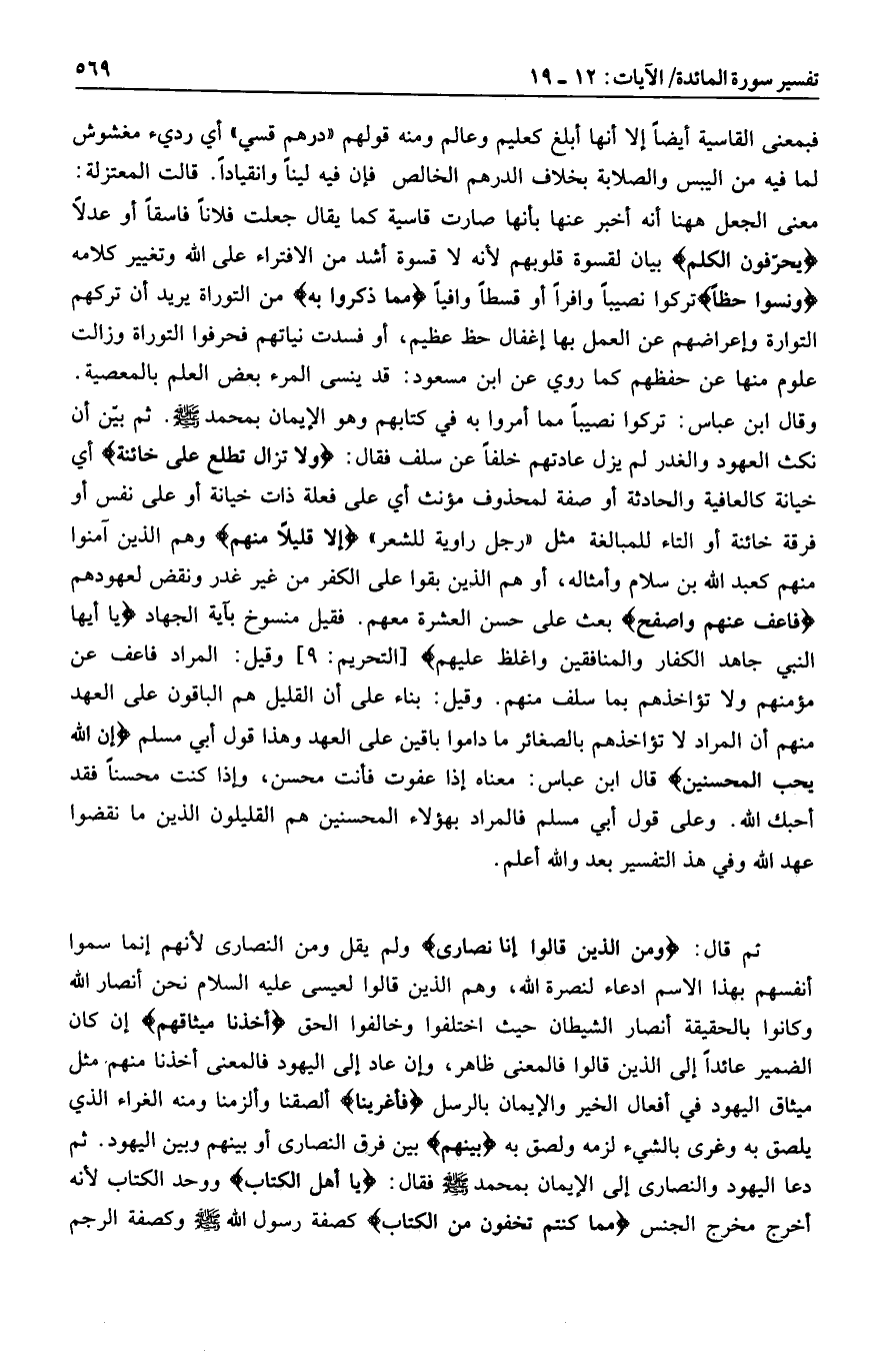وقال ابن عباس: تركوا نصيبا مما أمروا به في كتابهم وهو الإيمان بمحمد صلى الله عليه وسلم. ثم بيّن أن نكث العهود والغدر لم يزل عادتهم خلفا عن سلف فقال: وَلا تَزالُ تَطَّلِعُ عَلى خائِنَةٍ أي خيانة كالعافية والحادثة أو صفة لمحذوف مؤنث أي على فعلة ذات خيانة أو على نفس أو فرقة خائنة أو التاء للمبالغة مثل «رجل راوية للشعر» إِلَّا قَلِيلًا مِنْهُمْ وهم الذين آمنوا منهم كعبد الله بن سلام وأمثاله، أو هم الذين بقوا على الكفر من غير غدر ونقض لعهودهم فَاعْفُ عَنْهُمْ وَاصْفَحْ بعث على حسن العشرة معهم. فقيل منسوخ بآية الجهاد يا أَيُّهَا النَّبِيُّ جاهِدِ الْكُفَّارَ وَالْمُنافِقِينَ وَاغْلُظْ عَلَيْهِمْ [التحريم: 9] وقيل: المراد فاعف عن مؤمنهم ولا تؤاخذهم بما سلف منهم. وقيل: بناء على أن القليل هم الباقون على العهد منهم أن المراد لا تؤاخذهم بالصغائر ما داموا باقين على العهد وهذا قول أبي مسلم إِنَّ اللَّهَ يُحِبُّ الْمُحْسِنِينَ قال ابن عباس: معناه إذا عفوت فأنت محسن، وإذا كنت محسنا فقد أحبك الله. وعلى قول أبي مسلم فالمراد بهؤلاء المحسنين هم القليلون الذين ما نقضوا عهد الله وفي هذا التفسير بعد والله أعلم.