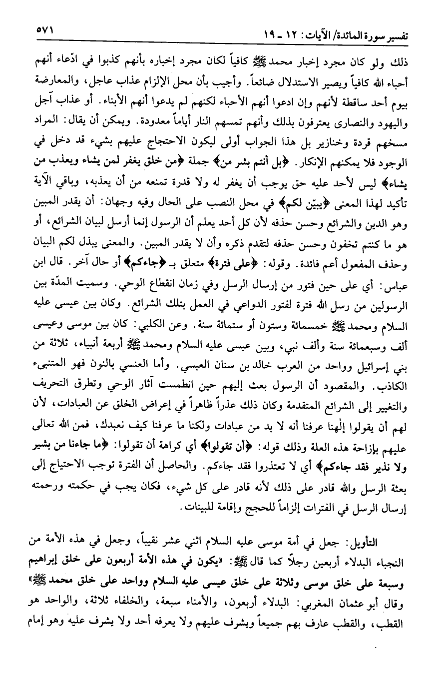 ذلك ولو كان مجرد إخبار محمد صلى الله عليه وسلم كافيا لكان مجرد إخباره بأنهم كذبوا في ادّعاء أنهم أحباء الله كافيا ويصير الاستدلال ضائعا. وأجيب بأن محل الإلزام عذاب عاجل، والمعارضة بيوم أحد ساقطة لأنهم وإن ادعوا أنهم الأحباء لكنهم لم يدعوا أنهم الأبناء. أو عذاب آجل واليهود والنصارى يعترفون بذلك وأنهم تمسهم النار أياما معدودة. ويمكن أن يقال: المراد مسخهم قردة وخنازير بل هذا الجواب أولى ليكون الاحتجاج عليهم بشيء قد دخل في الوجود فلا يمكنهم الإنكار. بَلْ أَنْتُمْ بَشَرٌ مِمَّنْ جملة مِمَّنْ خَلَقَ يَغْفِرُ لِمَنْ يَشاءُ وَيُعَذِّبُ مَنْ يَشاءُ ليس لأحد عليه حق يوجب أن يغفر له ولا قدرة تمنعه من أن يعذبه، وباقي الآية تأكيد لهذا المعنى يُبَيِّنُ لَكُمْ في محل النصب على الحال وفيه وجهان: أن يقدر المبين وهو الدين والشرائع وحسن حذفه لأن كل أحد يعلم أن الرسول إنما أرسل لبيان الشرائع، أو هو ما كنتم تخفون وحسن حذفه لتقدم ذكره وأن لا يقدر المبين. والمعنى يبذل لكم البيان وحذف المفعول أعم فائدة. وقوله: عَلى فَتْرَةٍ متعلق ب جاءَكُمْ أو حال آخر. قال ابن عباس: أي على حين فتور من إرسال الرسل وفي زمان انقطاع الوحي. وسميت المدّة بين الرسولين من رسل الله فترة لفتور الدواعي في العمل بتلك الشرائع. وكان بين عيسى عليه السلام ومحمد صلى الله عليه وسلم خمسمائة وستون أو ستمائة سنة. وعن الكلبي: كان بين موسى وعيسى ألف وسبعمائة سنة وألف نبي، وبين عيسى عليه السلام ومحمد صلى الله عليه وسلم أربعة أنبياء، ثلاثة من بني إسرائيل وواحد من العرب خالد بن سنان العبسي. وأما العنسي بالنون فهو المتنبئ الكاذب. والمقصود أن الرسول بعث إليهم حين انطمست آثار الوحي وتطرق التحريف والتغيير إلى الشرائع المتقدمة وكان ذلك عذرا ظاهرا في إعراض الخلق عن العبادات، لأن لهم أن يقولوا إلهنا عرفنا أنه لا بد من عبادات ولكنا ما عرفنا كيف نعبدك، فمن الله تعالى عليهم بإزاحة هذه العلة وذلك قوله: أَنْ تَقُولُوا أي كراهة أن تقولوا: ما جاءَنا مِنْ بَشِيرٍ وَلا نَذِيرٍ فَقَدْ جاءَكُمْ أي لا تعتذروا فقد جاءكم. والحاصل أن الفترة توجب الاحتياج إلى بعثة الرسل والله قادر على ذلك لأنه قادر على كل شيء، فكان يجب في حكمته ورحمته إرسال الرسل في الفترات إلزاما للحجج وإقامة للبينات.