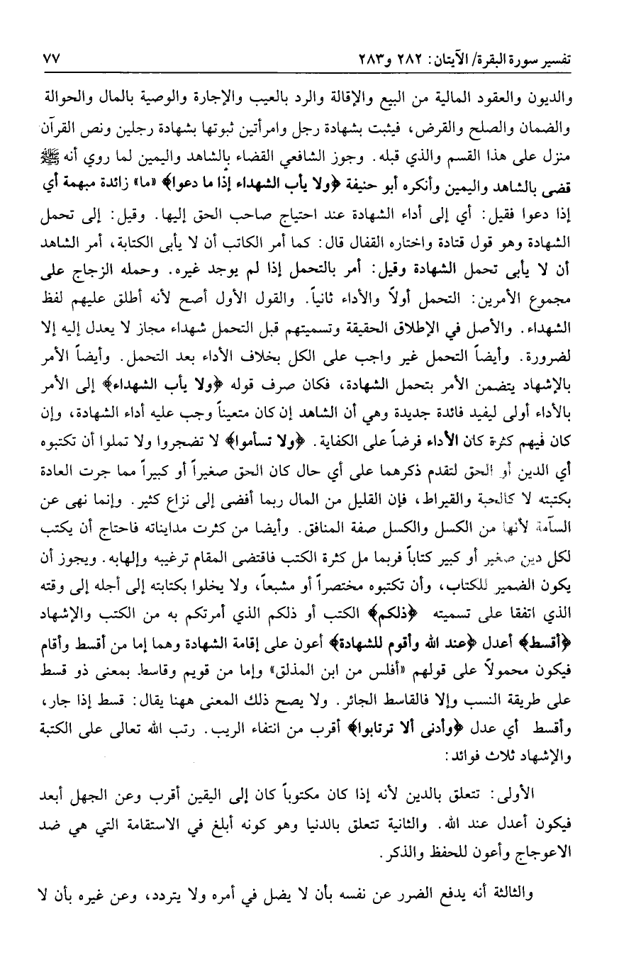 وأنكره أبو حنيفة وَلا يَأْبَ الشُّهَداءُ إِذا ما دُعُوا «ما» زائدة مبهمة أي إذا دعوا فقيل: أي إلى أداء الشهادة عند احتياج صاحب الحق إليها. وقيل: إلى تحمل الشهادة وهو قول قتادة واختاره القفال قال: كما أمر الكاتب أن لا يأبى الكتابة، أمر الشاهد أن لا يأبى تحمل الشهادة وقيل: أمر بالتحمل إذا لم يوجد غيره. وحمله الزجاج على مجموع الأمرين: التحمل أولا والأداء ثانيا. والقول الأول أصح لأنه أطلق عليهم لفظ الشهداء. والأصل في الإطلاق الحقيقة وتسميتهم قبل التحمل شهداء مجاز لا يعدل إليه إلا لضرورة. وأيضا التحمل غير واجب على الكل بخلاف الأداء بعد التحمل. وأيضا الأمر بالإشهاد يتضمن الأمر بتحمل الشهادة، فكان صرف قوله وَلا يَأْبَ الشُّهَداءُ إلى الأمر بالأداء أولى ليفيد فائدة جديدة وهي أن الشاهد إن كان متعينا وجب عليه أداء الشهادة، وإن كان فيهم كثرة كان الأداء فرضا على الكفاية. وَلا تَسْئَمُوا لا تضجروا ولا تملوا أن تكتبوه أي الدين أو الحق لتقدم ذكرهما على أي حال كان الحق صغيرا أو كبيرا مما جرت العادة بكتبته لا كالحبة والقيراط، فإن القليل من المال ربما أفضى إلى نزاع كثير. وإنما نهى عن السآمة لأنها من الكسل والكسل صفة المنافق. وأيضا من كثرت مدايناته فاحتاج أن يكتب لكل دين صغير أو كبير كتابا فربما مل كثرة الكتب فاقتضى المقام ترغيبه وإلهابه. ويجوز أن يكون الضمير للكتاب، وأن تكتبوه مختصرا أو مشبعا، ولا يخلوا بكتابته إلى أجله إلى وقته الذي اتفقا على تسميته ذلِكُمْ الكتب أو ذلكم الذي أمرتكم به من الكتب والإشهاد أَقْسَطُ أعدل عِنْدَ اللَّهِ وَأَقْوَمُ لِلشَّهادَةِ أعون على إقامة الشهادة وهما إما من أقسط وأقام فيكون محمولا على قولهم «أفلس من ابن المذلق» وإما من قويم وقاسط بمعنى ذو قسط على طريقة النسب وإلا فالقاسط الجائر. ولا يصح ذلك المعنى هاهنا يقال: قسط إذا جار، وأقسط أي عدل وَأَدْنى أَلَّا تَرْتابُوا أقرب من انتفاء الريب. رتب الله تعالى على الكتبة والإشهاد ثلاث فوائد: