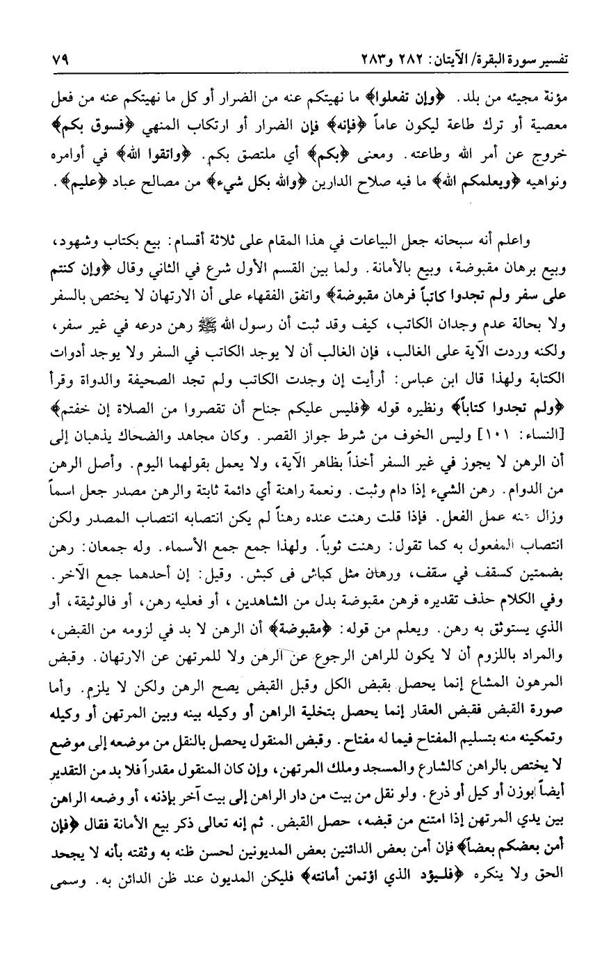 واعلم أنه سبحانه جعل البياعات في هذا المقام على ثلاثة أقسام: بيع بكتاب وشهود، وبيع برهان مقبوضة، وبيع بالأمانة. ولما بين القسم الأول شرع في الثاني وقال وَإِنْ كُنْتُمْ عَلى سَفَرٍ وَلَمْ تَجِدُوا كاتِباً فَرِهانٌ مَقْبُوضَةٌ واتفق الفقهاء على أن الارتهان لا يختص بالسفر ولا بحالة عدم وجدان الكاتب، كيف وقد ثبت أن رسول الله صلى الله عليه وسلم رهن درعه في غير سفر، ولكنه وردت الآية على الغالب، فإن الغالب أن لا يوجد الكاتب في السفر ولا يوجد أدوات الكتابة ولهذا قال ابن عباس: أرأيت إن وجدت الكاتب ولم تجد الصحيفة والدواة وقرأ ولم تجدوا كتابا ونظيره قوله فَلَيْسَ عَلَيْكُمْ جُناحٌ أَنْ تَقْصُرُوا مِنَ الصَّلاةِ إِنْ خِفْتُمْ [النساء: 101] وليس الخوف من شرط جواز القصر. وكان مجاهد والضحاك يذهبان إلى أن الرهن لا يجوز في غير السفر أخذا بظاهر الآية، ولا يعمل بقولهما اليوم. وأصل الرهن من الدوام. رهن الشيء إذا دام وثبت. ونعمة راهنة أي دائمة ثابتة والرهن مصدر جعل اسما وزال عنه عمل الفعل. فإذا قلت رهنت عنده رهنا لم يكن انتصابه انتصاب المصدر ولكن انتصاب المفعول به كما تقول: رهنت ثوبا. ولهذا جمع جمع الأسماء. وله جمعان: رهن بضمتين كسقف في سقف، ورهان مثل كباش في كبش. وقيل: إن أحدهما جمع الآخر.