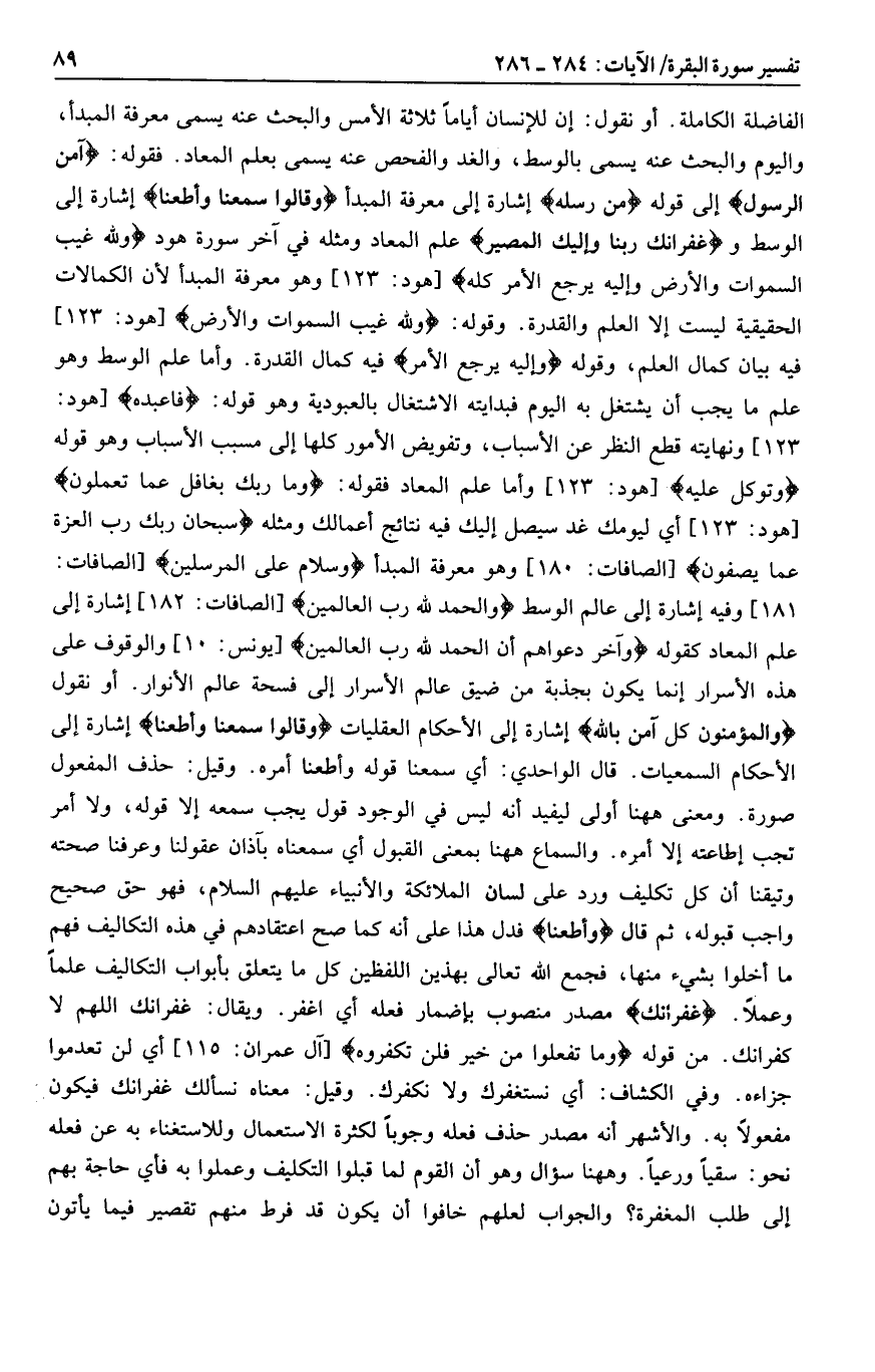 الفاضلة الكاملة. أو نقول: إن للإنسان أياما ثلاثة الأمس والبحث عنه يسمى معرفة المبدأ، واليوم والبحث عنه يسمى بالوسط، والغد والفحص عنه يسمى بعلم المعاد. فقوله: آمَنَ الرَّسُولُ إلى قوله مِنْ رُسُلِهِ إشارة إلى معرفة المبدأ وَقالُوا سَمِعْنا وَأَطَعْنا إشارة إلى الوسط وغُفْرانَكَ رَبَّنا وَإِلَيْكَ الْمَصِيرُ علم المعاد ومثله في آخر سورة هود وَلِلَّهِ غَيْبُ السَّماواتِ وَالْأَرْضِ وَإِلَيْهِ يُرْجَعُ الْأَمْرُ كُلُّهُ [هود: 123] وهو معرفة المبدأ لأن الكمالات الحقيقية ليست إلا العلم والقدرة. وقوله: وَلِلَّهِ غَيْبُ السَّماواتِ وَالْأَرْضِ [هود: 123] فيه بيان كمال العلم، وقوله وَإِلَيْهِ يُرْجَعُ الْأَمْرُ فيه كمال القدرة. وأما علم الوسط وهو علم ما يجب أن يشتغل به اليوم فبدايته الاشتغال بالعبودية وهو قوله: فَاعْبُدْهُ [هود: