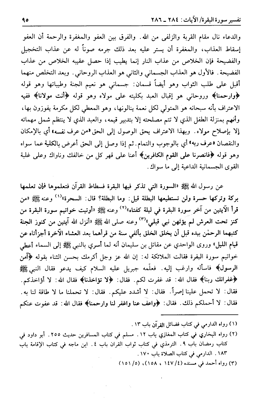 والدعاء نال مقام القربة والزلفى من الله. والفرق بين العفو والمغفرة والرحمة أن العفو إسقاط العذاب، والمغفرة أن يستر عليه بعد ذلك جرمه صونا له عن عذاب التخجيل والفضيحة فإن الخلاص من عذاب النار إنما يطيب إذا حصل عقيبه الخلاص من عذاب الفضيحة. فالأول هو العذاب الجسماني والثاني هو العذاب الروحاني. وبعد التخلص منهما أقبل على طلب الثواب وهو أيضا قسمان: جسماني هو نعيم الجنة وطيباتها وهو قوله وَارْحَمْنا وروحاني هو إقبال العبد بكليته على مولاه وهو قوله أَنْتَ مَوْلانا ففيه الاعتراف بأنه سبحانه هو المتولي لكل نعمة ينالونها، وهو المعطي لكل مكرمة يفوزون بها، وأنهم بمنزلة الطفل الذي لا تتم مصلحته إلا بتدبير قيمه، والعبد الذي لا ينتظم شمل مهماته إلا بإصلاح مولاه. وبهذا الاعتراف يحق الوصول إلى الحق