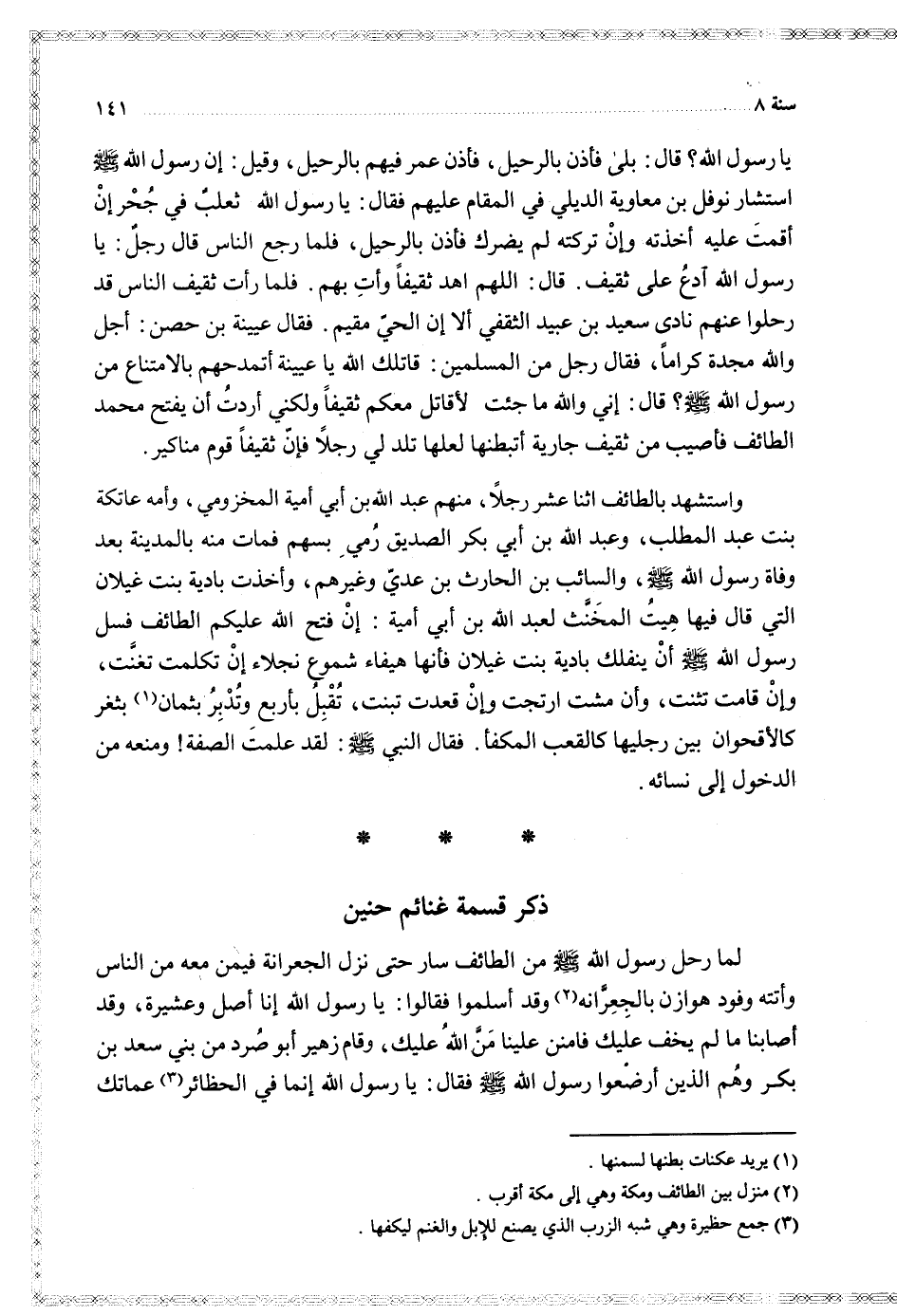 يا رسول الله قال بلى فأذن بالرحيل فأذن عمر فيهم بالرحيل وقيل إن رسول الله استشار نوفل بن معاوية الديلي في المقام عليهم فقال يا رسول الله ثعلب في جحر إن أقمت عليه أخذته وإن تركته لم يضرك فأذن بالرحيل فلما رجع الناس قال رجل يا رسول الله ادع على ثقيف قال اللهم اهد ثقيفا وأت بهم فلما رأت ثقيف الناس قد رحلوا عنهم نادى سعيد بن عبيد الثقفي ألا إن الحي مقيم فقال عيينة بن حصن أجل والله مجدة كراما فقال رجل من المسلمين قاتلك الله يا عيينة أتمدحهم بالامتناع عن رسول الله قال إني والله ما جئت لأقاتل معكم ثقيفا ولكني أردت أن يفتح محمد الطائف فأصيب من ثقيف جارية أتبطنها لعلها تلد لي رجلا فإن ثقيفا قوم مناكير
