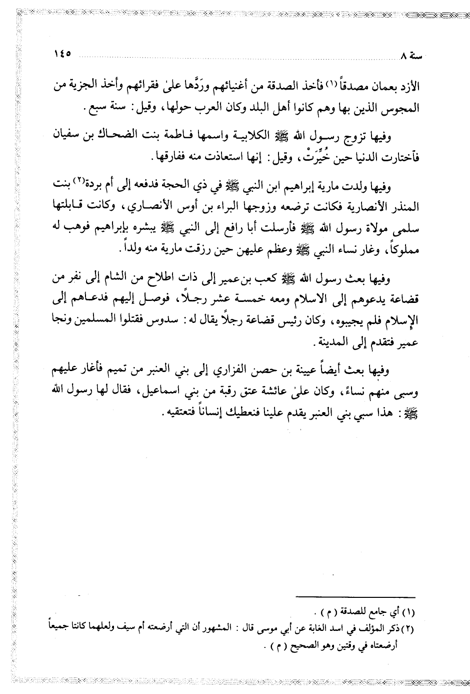 وفيها ولدت مارية إبراهيم ابن النبي في ذي الحجة فدفعه إلى أم بردة بنت المنذر الأنصارية فكانت ترضعه وزوجها البراء بن أوس الأنصاري وكانت قابلتها سلمى مولاة رسول الله فأرسلت أبا رافع إلى النبي يبشره بإبراهيم فوهب له مملوكا وغار نساء النبي وعظم عليهن حين رزقت مارية منه ولدا