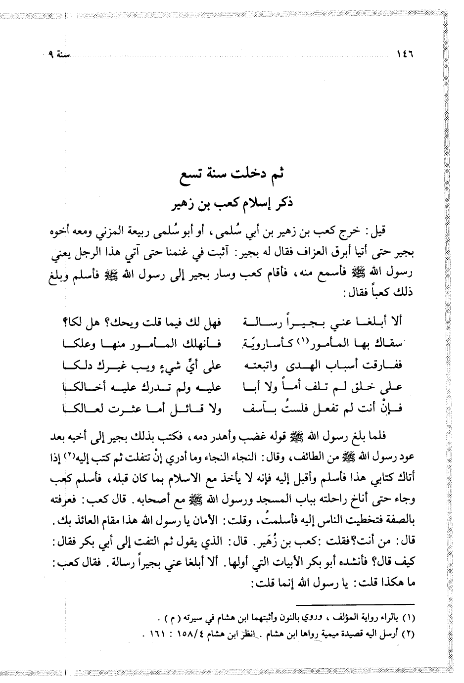 فلما بلغ رسول الله قوله غضب وأهدر دمه فكتب بذلك بجير إلى أخيه بعد عود رسول الله من الطائف وقال النجاء النجاء وما أدري إن تتفلت ثم كتب إليه إذا أتاك كتابي هذا فأسلم وأقبل إليه فإنه لا يأخذ مع الإسلام بما كان قبله فأسلم كعب وجاء حتى أناخ راحلته بباب المسجد ورسول الله مع أصحابه قال كعب فعرفته بالصفة فتخطيت الناس إليه فأسلمت وقلت الأمان يا رسول الله هذا مقام العائذ بك قال من أنت فقلت كعب بن زهير قال الذي يقول ثم التفت إلى أبي بكر فقال كيف قال فأنشده أبو بكر الأبيات التي أولها ألا أبلغا عني بجيرا رسالة فقال كعب ما هكذا قلت يا رسول الله إنما قلت