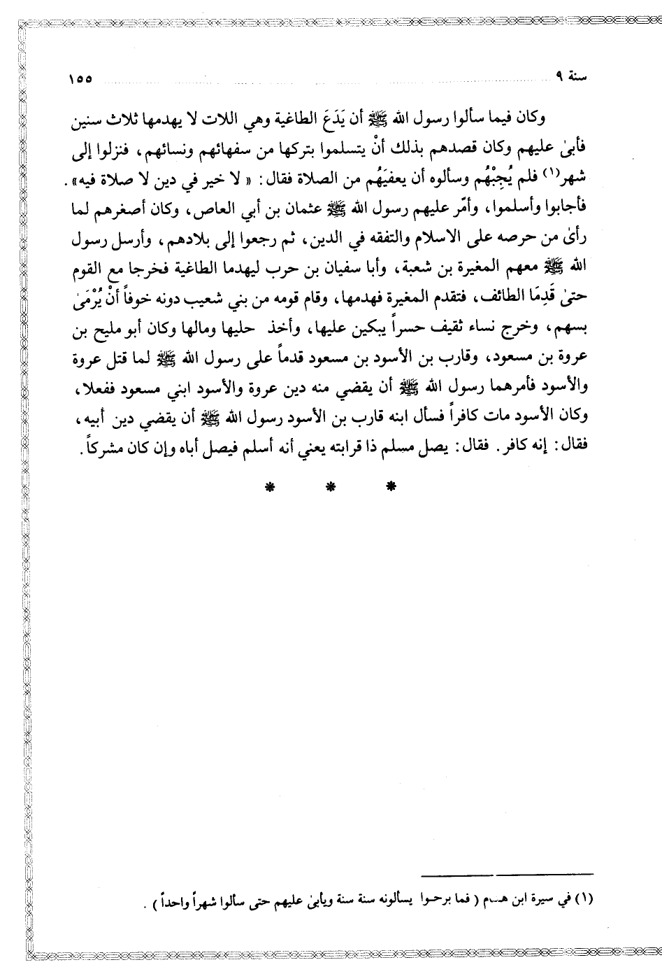 وكان فيما سألوا رسول الله أن يدع الطاغية وهي اللات لا يهدمها ثلاث سنين فأبى عليهم وكان قصدهم بذلك أن يتسلموا بتركها من سفهائهم ونسائهم فنزلوا إلى شهر فلم يجبهم وسألوه أن يعفيهم من الصلاة فقال لا خير في دين لا صلاة فيه فأجابوا وأسلموا وأمر عليهم رسول الله عثمان بن أبي العاص وكان أصغرهم لما رأى من حرصه على الإسلام والتفقه في الدين ثم رجعوا إلى بلادهم وأرسل رسول الله معهم المغيرة بن شعبة وأبا سفيان بن حرب ليهدما الطاغية فخرجا مع القوم حتى قدما الطائف فتقدم المغيرة فهدمها وقام قومه من بني شعيب دونه خوفا أن يرمى بسهم وخرج نساء ثقيف حسرا يبكين عليها وأخذ حليها ومالها وكان أبو مليح بن عروة بن مسعود وقراب بن الأسود بن مسعود قدما على رسول الله لما قتل عروة والأسود فأمرهما رسول الله أن يقضي منه دين عروة والأسود ابني مسعود ففعلا وكان الأسود مات كافرا فسأل ابنه قارب بن الأسود رسول الله أن يقضي دين أبيه فقال إنه كافر فقال يصل مسلم ذا قرابته يعني أنه أسلم فيصل أباه وإن كان مشركا