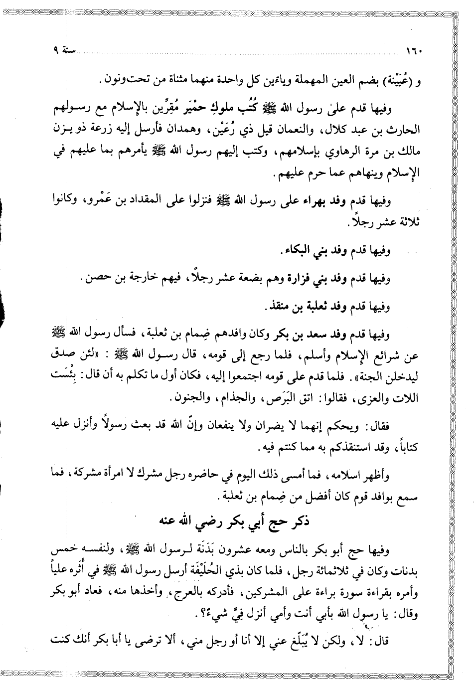 $ وفيها حج أبو بكر بالناس ومعه عشرون بدنة لرسول الله ولنفسه خمس بدنات وكان في ثلاثمائة رجل فلما كان بذي الحليفة أرسل رسول الله في أثره عليا وأمره بقراءة سور براءة على المشركين فأدركه بالعرج وأخذها منه فعاد أبو بكر وقال يا رسول الله بأبي أنت وأمي أنزل في شيء