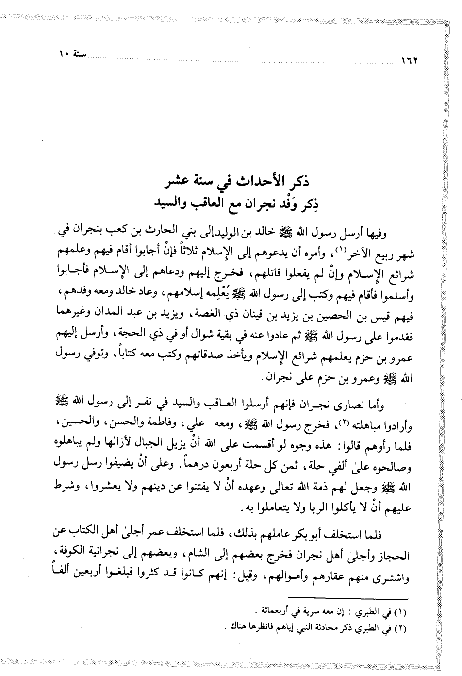 وأما نصارى نجران فإنهم أرسلوا العاقب والسيد في نفر إلى رسول الله وأرادوا مباهلته فخرج رسول الله ومعه علي وفاطمة والحسن والحسين فلما رأوهم قالوا هذه وجوه لو أقسمت على الله أن يزيل الجبال لأزالها ولم يباهلوه وصالحوه على ألفي حلة ثمن كل حلة أربعون درهما وعلى أن يضيفوا رسل رسول الله وجعل لهم ذمة الله تعالى وعهده أن لا يفتنوا عن دينهم ولا يعشروا وشرط عليهم أن لا يأكلوا الربا ولا يتعاملوا به