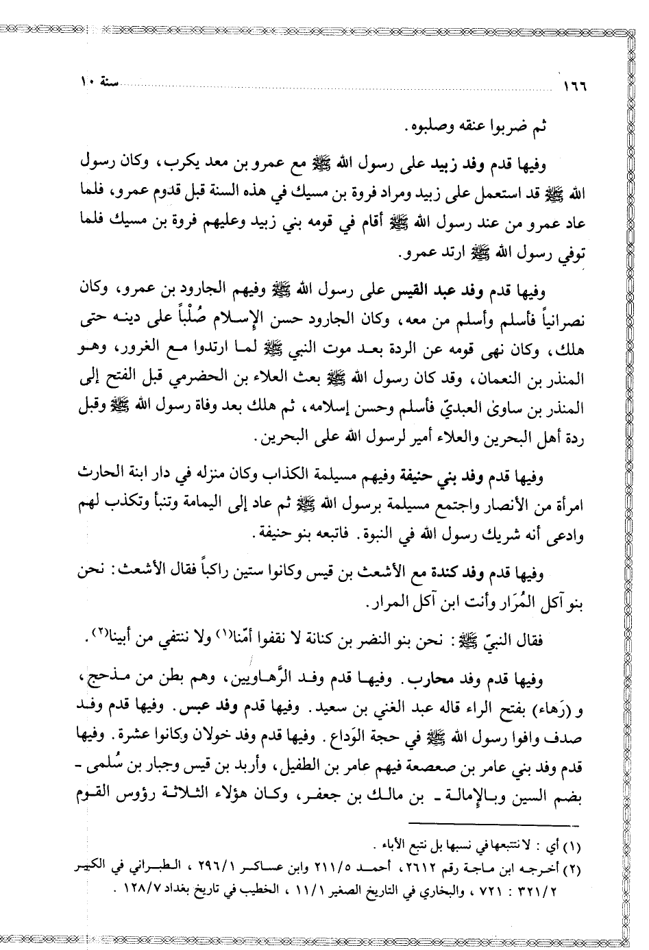 وفيها قدم وفد محارب وفيها قدم وفد الرهاويين وهم بطن من مذحج ورهاء بفتح الراء قاله عبد الغني بن سعيد وفيها قدم وفد عبس وفيها قدم وفد صدف وافوا رسول الله في حجة الوداع وفيها قدم وفد خولان وكانوا عشرة وفيها قدم وفد بني عامر بن صعصعة فيهم عامر بن الطفيل وأربد بن قيس وجبار بن سلمى بضم السين وبالإمالة بن مالك بن جعفر وكان هؤلاء الثلاثة رؤوس القوم