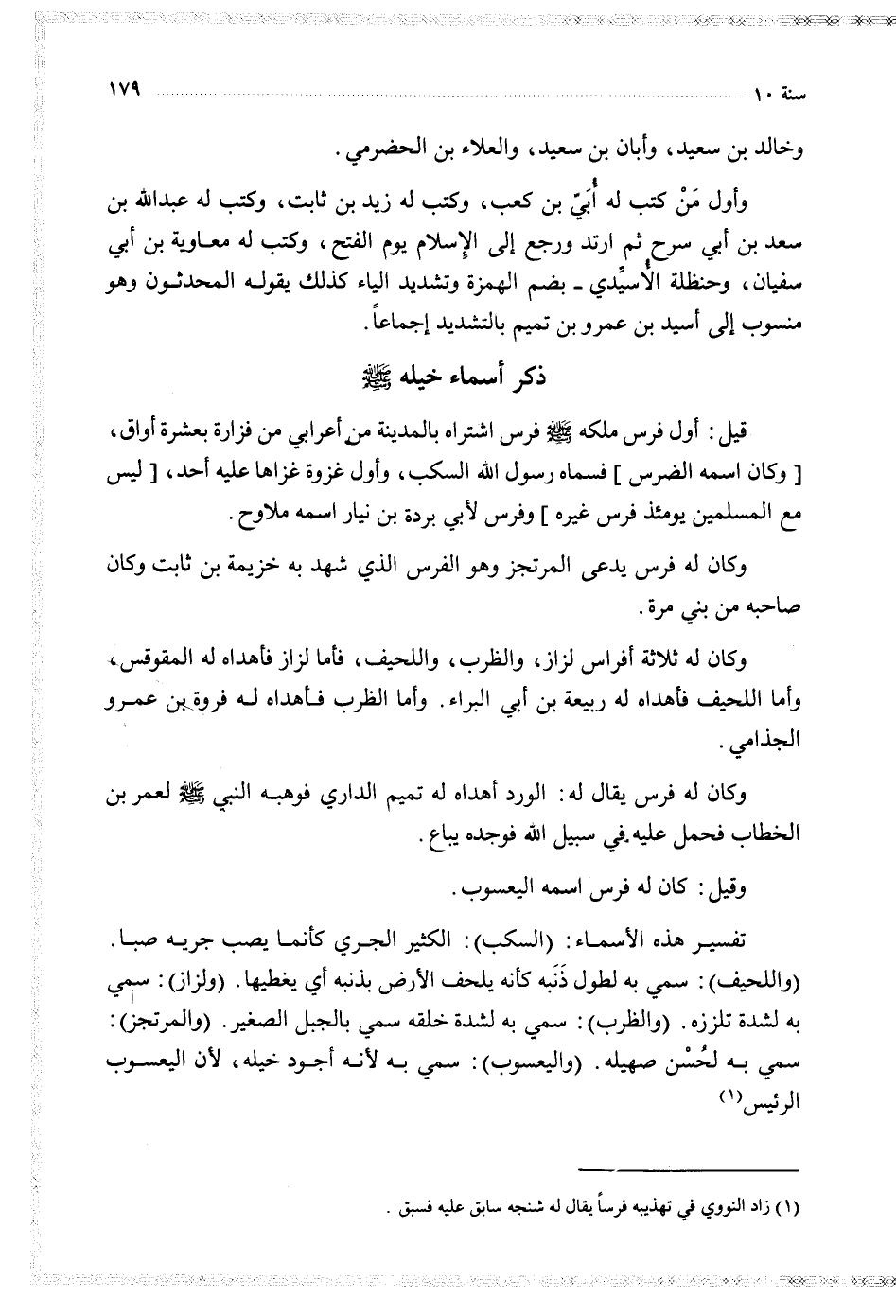 قيل أول فرس ملكه فرس اشتراه بالمدينة من أعرابي من فزارة بعشرة أواق وكان اسمه الضرس فسماه رسول الله السكب وأول غزوة غزاها عليه أحد ليس مع المسلمين يومئذ فرس غيره وفرس لأبي بردة بن نيار اسمه ملاوح