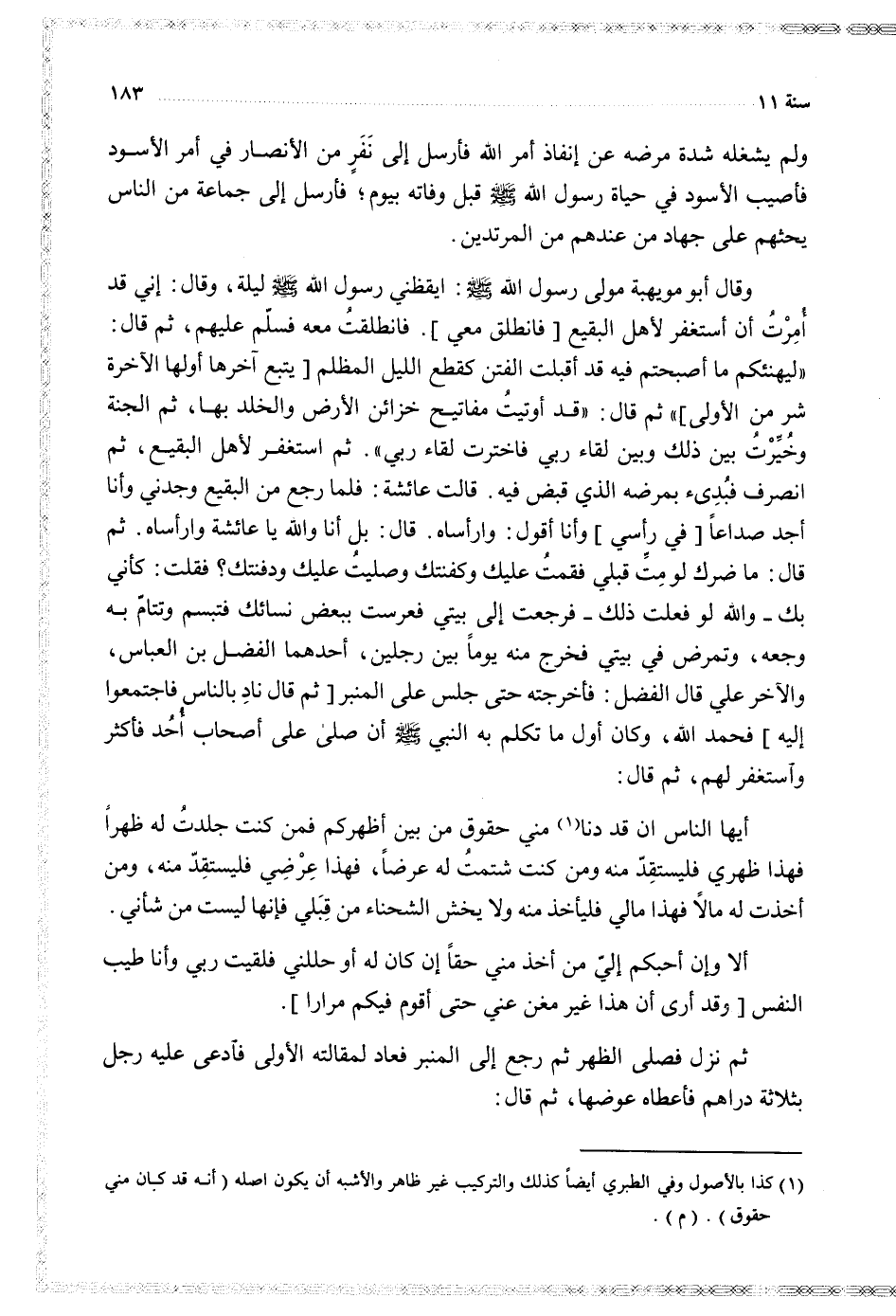 أيها الناس أن قد دنا مني حقوق من بين أظهركم فمن كنت جلدت له ظهرا فهذا ظهري فليستقد منه ومن كنت شتمت له عرضا فهذا عرضي فليستقد منه ومن أخذت له مالا فهذا مالي فليأخذ منه ولا يخش الشحناء من قبلي فإنها ليست من شأني
