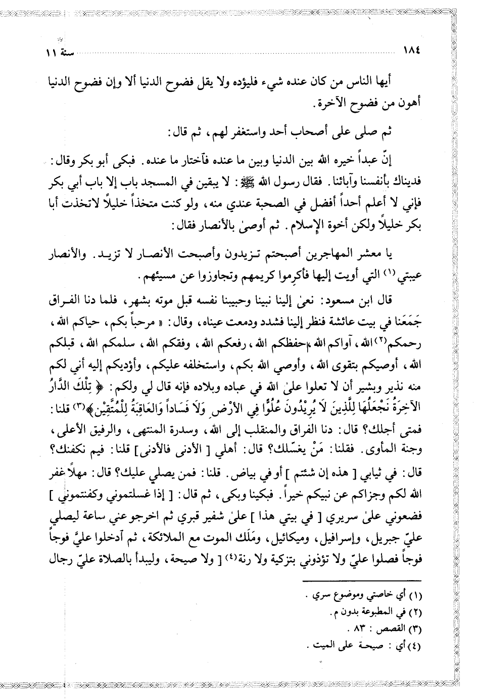قال ابن مسعود نعى إلينا نبينا وحبيبنا نفسه قبل موته بشهر فلما دنا الفراق جمعنا في بيت عائشة فنظر إلينا فشدد ودمعت عيناه وقال مرحبا بكم حياكم الله رحمكم الله آواكم الله حفظكم الله رفعكم الله وفقكم الله سلمكم الله قبلكم الله أوصيكم بتقوى الله وأوصي الله بكم واستخلفه عليكم وأؤديكم إليه إني لكم منه نذير وبشير أن لا تعلوا على الله في عباده وبلاده فإنه قال لي ولكم { تلك الدار الآخرة نجعلها للذين لا يريدون علوا في الأرض ولا فسادا والعاقبة للمتقين } قلنا فمتى أجلك قال دنا الفراق والمنقلب إلى الله وسدرة المنتهى والرفيق الأعلى وجنة المأوى فقلنا من يغسلك قال أهلي الأدنى فالأدنى قلنا فيم نكفنك قال في ثيابي هذه إن شئتم أو في بياض قلنا فمن يصلي عليك قال مهلا غفر الله لكم وجزاكم عن نبيكم خيرا فبكينا وبكى ثم قال إذا غسلتموني وكفنتموني فضعوني على سريري في بيتي هذا على شفير قبري ثم اخرجوا عني ساعة ليصلي علي جبريل وإسرافيل وميكائيل وملك الموت مع الملائكة ثم ادخلوا علي فوجا فوجا فصلوا علي ولا تؤذوني بتزكية ولا رنة ولا صيحة وليبدأ بالصلاة علي رجال