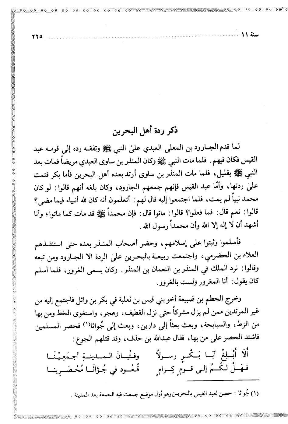 وخرج الحطم بن ضبيعة أخو بني قيس بن ثعلبة في بكر بن وائل فاجتمع إليه من غير المرتدين ممن لم يزل مشركا حتى نزل القطيف وهجر واستغوى الخط ومن بها من الزط والسبابحة وبعث بعثا إلى دارين وبعث إلى جواثا فحصر المسلمين فاشتد الحصر على من بها فقال عبد الله بن حذف وقد قتلهم الجوع