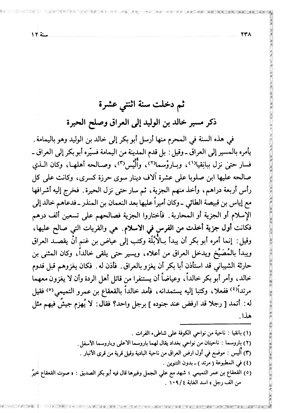 في هذه السنة في المحرم منها أرسل أبو بكر إلى خالد بن الوليد وهو باليمامة يأمره بالمسير إلى العراق وقيل بل قدم المدينة من اليمامة فسيره أبو بكر إلى العراق فسار حتى نزل ببانقيا وباروسما وأليس وصالحه أهلها وكان الذي صالحه عليها ابن صلوبا على عشرة آلاف دينار سوى حرزة كسرى وكانت على كل رأس أربعة دراهم وأخذ منهم الجزية ثم سار حتى نزل الحيرة فخرج إليه أشرافها مع إياس بن قبيصة الطائي وكان أميرا عليها بعد النعمان بن المنذر فدعاهم خالد إلى الإسلام أو الجزية أو المحاربة فاختاروا الجزية فصالحهم على تسعين ألف درهم فكانت أول جزية أخذت من الفرس في الإسلام هي والقريات التي صالح عليها وقيل إنما أمره أبو بكر أن يبدأ بالأبلة وكتب إلى عياض بن غنم أن يقصد العراق ويبدأ بالمصيخ ويدخل العراق من أعلاه ويسير حتى يلقى خالدا وكان المثنى بن حارثة الشيباني قد استأذن أبا بكر أن يغزو بالعراق فأذن له فكان يغزوهم قبل قدوم خالد وأمر أبو بكر خالدا وعياضا أن يستنفرا من قاتل أهل الردة وأن لا يغزون معهما مرتدا ففعلا وكتبا إليه يستمدانه فأمد خالدا بالقعقاع بن عمرو التميمي فقيل له أتمد رجلا قد ارفض عند جنوده برجل واحد فقال لا يهزم جيش فيهم مثل هذا