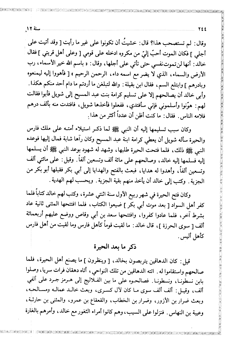 وكان فتح الحيرة في شهر ربيع الأول سنة اثنتي عشرة وكتب لهم خالد كتابا فلما كفر أهل السواد بعد موت أبي بكر ضيعوا الكتاب فلما افتتحها المثنى ثانية عاد بشرط آخر فلما عادوا كفروا وافتتحها سعد بن أبي وقاص ووضع عليهم أربعمائة ألف سوى الحرزة قال خالد ما لقيت قوما كأهل فارس وما لقيت من أهل فارس كأهل أليس
