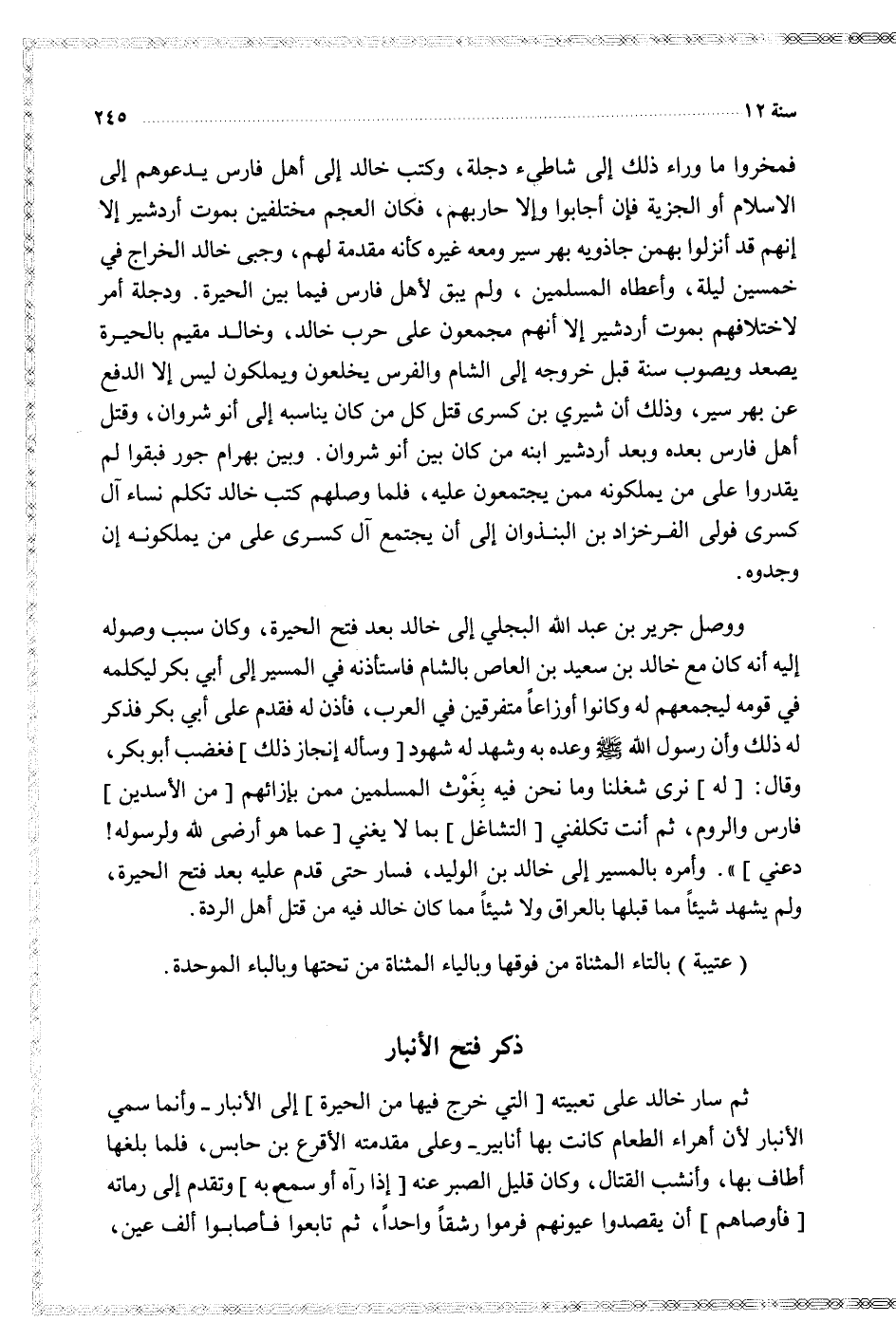فمخروا ما وراء ذلك إلى شاطئ دجلة وكتب خالد إلى أهل فارس يدعوهم إلى الإسلام أو الجزية فإن أجابوا وإلا حاربهم فكان العجم مختلفين بموت أردشير إلا أنهم قد أنزلوا بهمن جاذويه بهرسير ومعه غيره كأنه مقدمة لهم وجبى خالد الخراج في خمسين ليلة وأعطاه المسلمين ولم يبق لأهل فارس فيما بين الحيرة ودجلة أمر لاختلافهم بموت أردشير إلا أنهم مجمعون على حرب خالد وخالد مقيم بالحيرة يصعد ويصوب سنة قبل خروجه إلى الشام والفرس يخلعون ويملكون ليس إلا الدفع عن بهر سير وذلك أن شيري بن كسرى قتل كل من كان يناسبه إلى أنو شروان وقتل أهل فارس بعده وبعد أردشير ابنه من كان بين أنو شروان وبين بهرام جور فبقوا لم يقدروا على من يملكونه ممن يجتمعون عليه فلما وصلهم كتب خالد تكلم نساء آل كسرى فولى الفرخزاد بن البنذوان إلى أن يجتمع آل كسرى على من يملكونه إن وجدوه