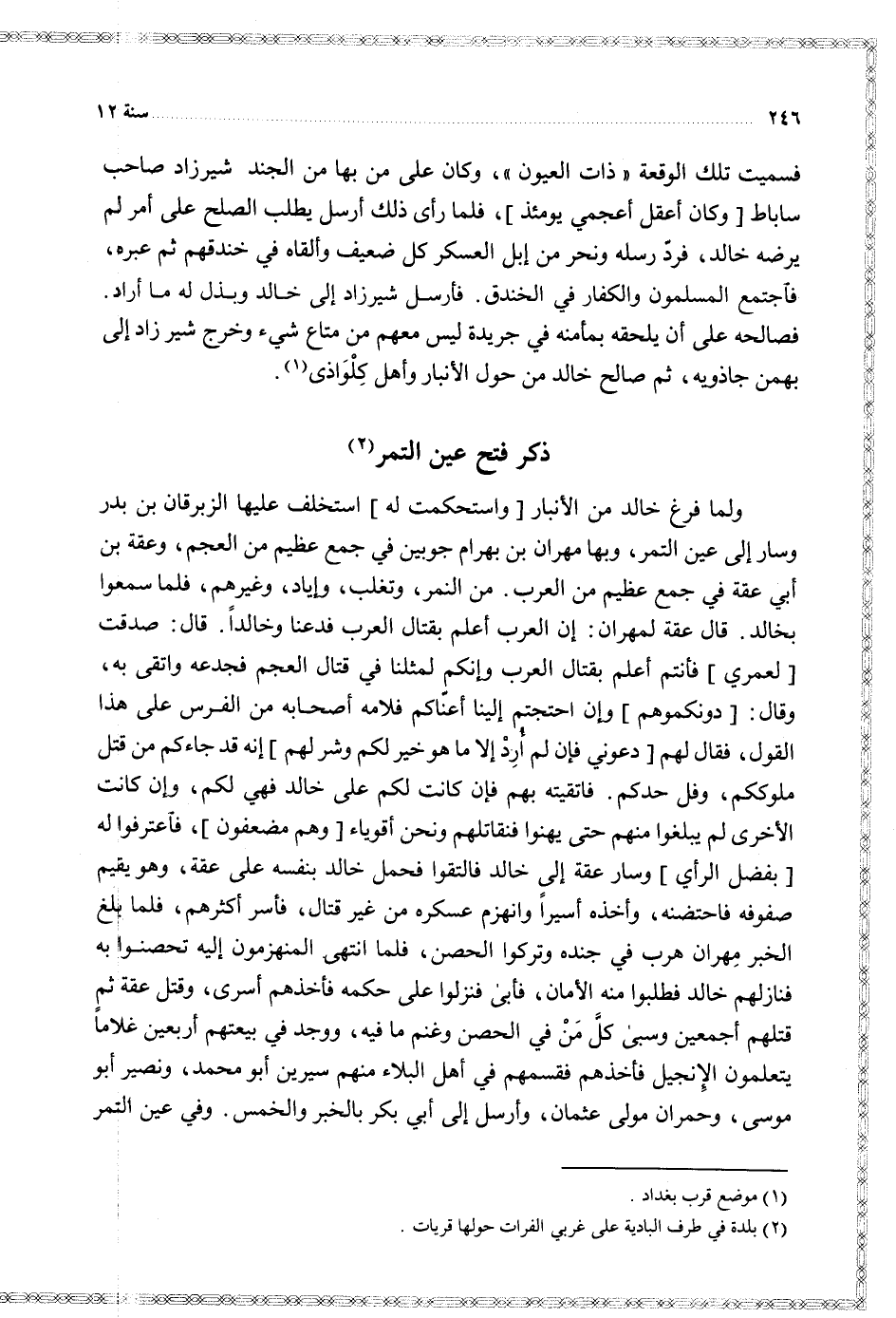 ولما فرغ خالد من الأنبار واستحكمت له استخلف عليها الزبرقان بن بدر وسار إلى عين التمر وبها مهران بن بهرام جوبين في جمع عظيم من العجم وعقة بن أبي عقة في جمع عظيم من العرب من النمر وتغلب وإياد وغيرهم فلما سمعوا بخالد قال عقة لمهران إن العرب أعلم بقتال العرب فدعنا وخالدا قال صدقت لعمري فأنتم أعلم بقتال العرب وإنكم لمثلنا في قتال العجم فجدعه واتقى به وقال دونكموهم وإن احتجتم إلينا أعناكم فلامه أصحابه من الفرس على هذا القول فقال لهم دعوني فإن لم أرد إلا ما هو خير لكم وشر لهم إنه قد جاءكم من قتل ملوككم وفل حدكم فاتقيته بهم فإن كانت لكم على خالد فهي لكم وإن كانت الأخرى لم يبلغوا منهم حتى يهنوا فنقاتلهم ونحن أقوياء وهم مضعفون فاعترفوا له بفضل الرأي وسار عقة إلى خالد فالتقوا فحمل خالد بنفسه على عقة وهو يقيم صفوفه فاحتضنه وأخذه أسيرا وانهزم عسكره من غير قتال فأسر أكثرهم فلما بلغ الخبر مهران هرب في جنده وتركوا الحصن فلما انتهى المنهزمون إليه تحصنوا به فنازلهم خالد فطلبوا منه الأمان فأبى فنزلوا على حكمه فأخذهم أسرى وقتل عقة ثم قتلهم أجمعين وسبى كل من في الحصن وغنم ما فيه ووجد في بيعتهم أربعين غلاما يتعلمون الغنجيل فأخذهم فقسمهم في أهل البلاء منهم سيرين أبو محمد ونصير أبو موسى وحمران مولى عثمان وأرسل إلى أبي بكر بالخبر والخمس وفي عين التمر