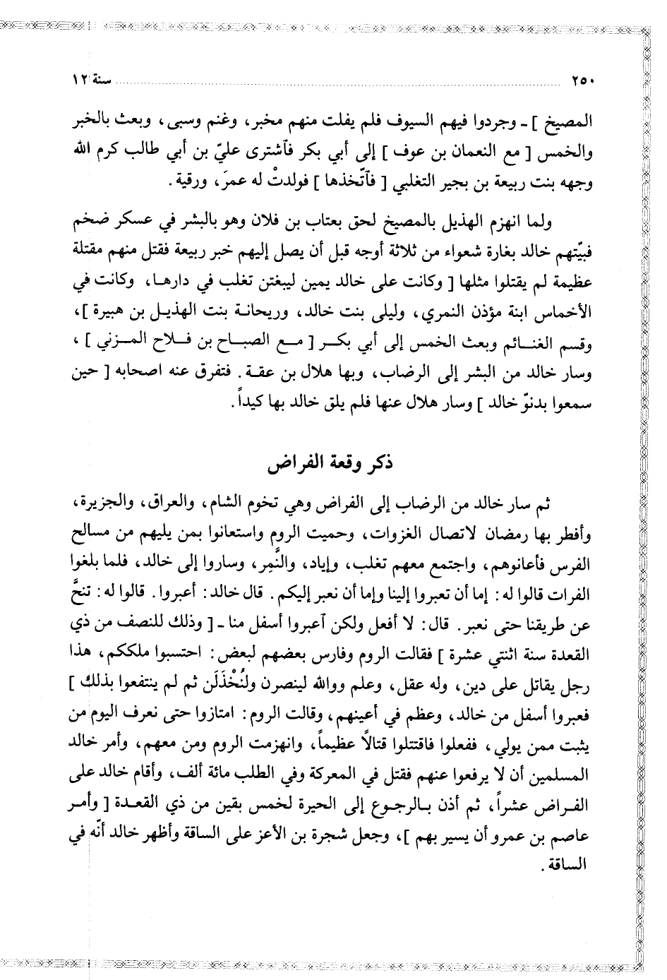 ثم سار خالد من الرضاب إلى الفراض وهي تخوم الشام والعراق والجزيرة وأفطر بها رمضان لاتصال الغزوات وحميت الروم واستعانوا بمن يليهم من مسالح الفرس فأعانوهم واجتمع معهم تغلب وإياد والنمر وساروا إلى خالد فلما بلغوا الفرات قالوا له إما أن تعبروا إلينا وإما أن نعبر إليكم قال خالد اعبروا قالوا له تنح عن طريقنا حتى نعبر قال لا أفعل ولكن اعبروا أسفل منا وذلك للنصف من ذي القعدة سنة اثنتي عشرة فقالت الروم وفارس بعضهم لبعض احتسبوا ملككم هذا رجل يقاتل على دين وله عقل وعلم ووالله لينصرن ولنخذلن ثم لم ينتفعوا بذلك فعبروا أسفل من خالد وعظم في أعينهم وقال الروم امتازوا حتى نعرف اليوم من يثبت ممن يولي ففعلوا فاقتتلوا قتالا عظيما وانهزمت الروم ومن معهم وأمر خالد المسلمين أن لا يرفعوا عنهم فقتل في المعركة وفي الطلب مائة ألف وأقام خالد على الفراض عشرا ثم أذن بالرجوع إلى الحيرة لخمس بقين من ذي القعدة وأمر عاصم بن عمرو أن يسير بهم وجعل شجرة بن الأعز على الساقة وأظهر خالد أنه في الساقة