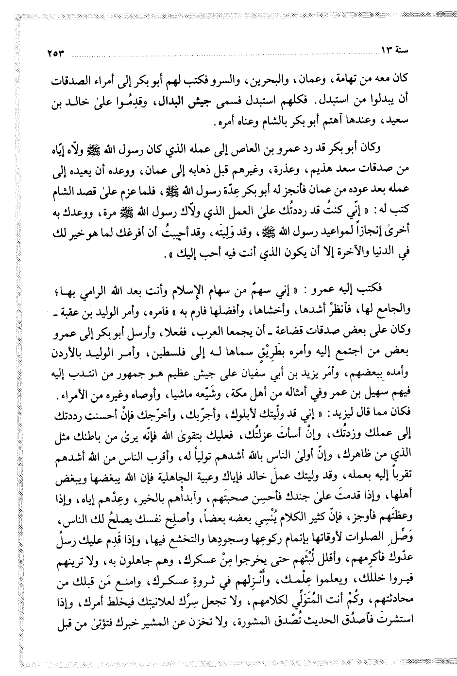 فكتب إليه عمرو إني سهم من سهام الإسلام وأنت بعد الله الرامي بها والجامع لها فانظر أشدها وأخشاها وأفضلها فارم به فأمره وأمر الوليد بن عقبة وكان على بعض صدقات قضاعة أن يجمعا العرب ففعلا وأرسل أبو بكر إلى عمرو بعض من اجتمع إليه وأمره بطريق سماها له إلى فلسطين وأمر الوليد بالأردن وأمده ببعضهم وأمر يزيد بن أبي سفيان على جيش عظيم هو جمهور من انتدب إليه فيهم سهيل بن عمر وفي أمثاله من أهل مكة وشيعه ماشيا وأوصاه وغيره من الأمراء فكان مما قال ليزيد إني قد وليتك لأبلوك وأجربك وأخرجك فإن أحسنت رددتك إلى عملك وزدتك وإن أسأت عزلتك فعليك بتقوى الله فإنه يرى من باطنك مثل الذي من ظاهرك وإن أولى الناس بالله أشدهم توليا له وأقرب الناس من الله أشدهم تقربا إليه بعمله وقد وليتك عمل خالد فإياك وعبية الجاهلية فإن الله يبغضها ويبغض أهلها وإذا قدمت على جندك فأحسن صحبتهم وابدأهم بالخير وعدهم إياه وإذا وعظتهم فأوجز فإن كثير الكلام ينسي بعضه بعضا وأصلح نفسك يصلح لك الناس وصل الصلوات لأوقاتها بإتمام ركوعها وسجودها والتخشع فيها وإذا قدم عليك رسل عدوك فأكرمهم وأقلل لبثهم حتى يخرجوا من عسكرك وهو جاهلون به ولا ترينهم فيروا خللك ويعلموا علمك وأنزلهم في ثروة عسكرك وامنع من قبلك من محادثتهم وكم أنت المتولي لكلامهم ولا تجعل سرك لعلانيتك فيخلط أمرك وإذا استشرت فاصدق الحديث تصدق المشورة ولا تخزن عن المشير خبرك فتؤتى من قبل