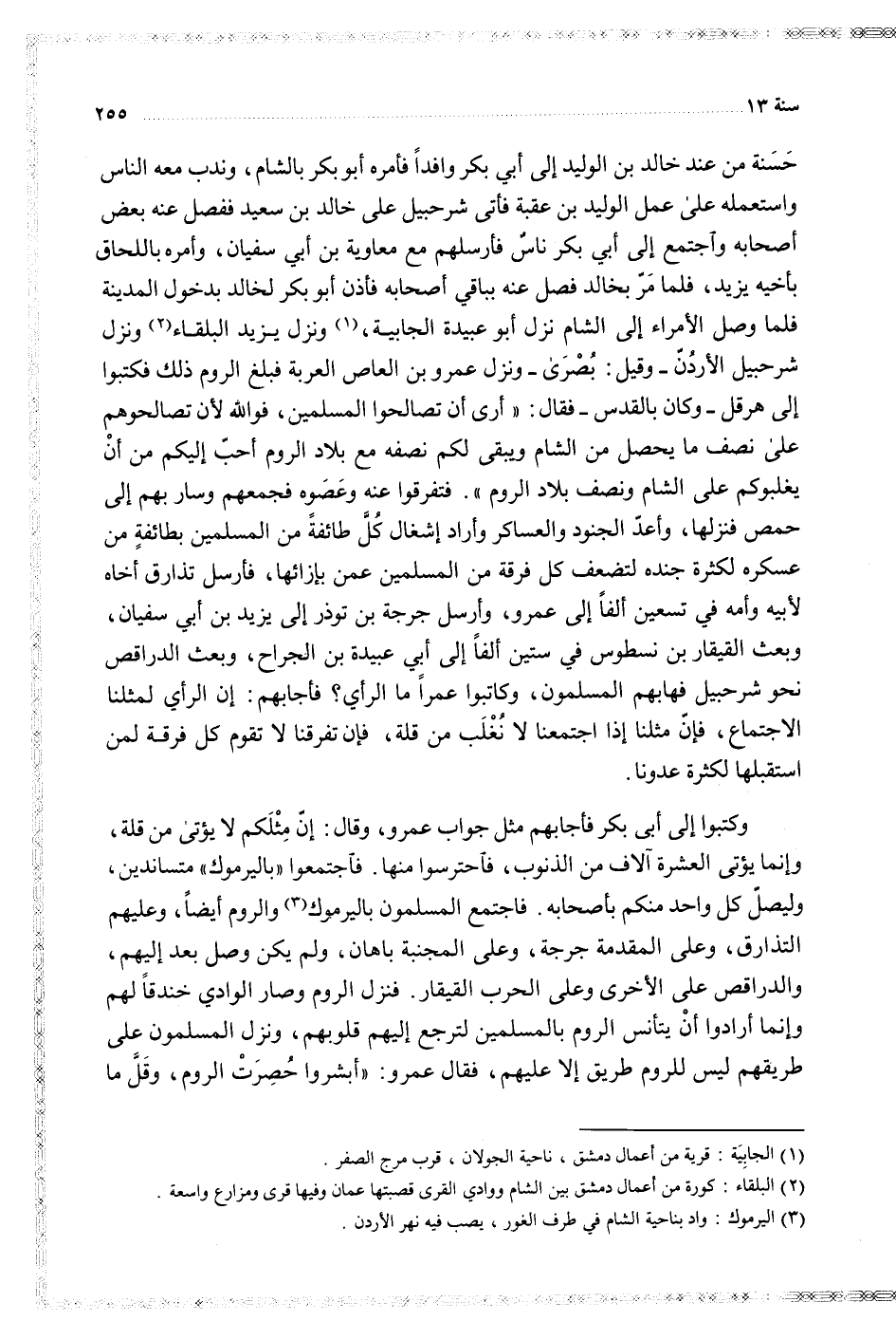 حسنة من عند خالد بن الوليد إلى أبي بكر وافدا فأمره أبو بكر بالشام وندب معه الناس واستعمله على عمل الوليد بن عقبة فأتى شرحبيل على خالد بن سعيد ففصل عنه بعض أصحابه واجتمع إلى أبي بكر ناس فأرسلهم مع معاوية بن أبي سفيان وأمره باللحاق بأخيه يزيد فلما مر بخالد فصل عنه بباقي أصحابه فأذن أبو بكر لخالد بدخول المدينة فلما وصل الأمراء إلى الشام نزل أبو عبيدة الجابية ونزل يزيد البلقاء ونزل شرحبيل الأردن وقيل بصرى ونزل عمرو بن العاص العربة فبلغ الروم ذلك فكتبوا إلى هرقل وكان بالقدس فقال أرى أن تصالحوا المسلمين فوالله لأن تصالحوهم على نصف ما يحصل من الشام ويبقى لكم نصفه مع بلاد الروم أحب إليكم من أن يغلبوكم على الشام ونصف بلاد الروم فتفرقوا عنه وعصوه فجمعهم وسار بهم إلى حمص فنزلها وأعد الجنود والعساكر وأراد إشغال كل طائفة من المسلمين عمن بإزائها فأرسلا تذارق أخاه لأبيه وأمه في تسعين ألفا إلى عمرو وأرسل جرجة بن توذر إلى يزيد بن أبي سفيان وبعث القيقار بن نسطوس في ستين ألفا إلى أبي عبيدة بن الجراح وبعث الدراقص نحو شرحبيل فهابهم المسلمون وكاتبوا عمرا ما الرأي فأجابهم إن الرأي لمثلنا الاجتماع فإن مثلنا إذا اجتمعنا لا نغلب من قلة فإن تفرقنا لا تقوم كل فرقة لمن استقبلها لكثرة عدونا