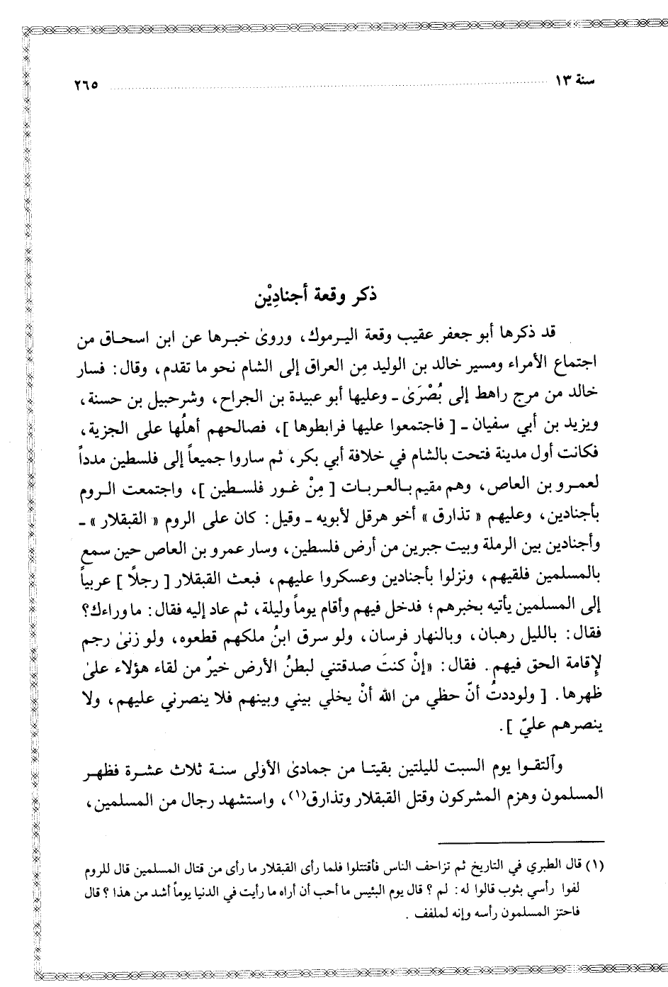 قد ذكرها أبو جعفر عقيب وقعة اليرموك وروى خبرها عن ابن إسحاق من اجتماع الأمراء ومسير خالد بن الوليد من العراق إلى الشام نحو ما تقدم وقال فسار خالد من مرج راهط إلى بصرى وعليها أبو عبيدة بن الجراح وشرحبيل بن حسنة ويزيد بن أبي سفيان فاجتمعوا عليها فرابطوها فصالحهم أهلها على الجزية فكانت أول مدينة فتحت بالشام في خلافة أبي بكر ثم ساروا جميعا إلى فلسطين مددا لعمرو بن العاص وهم مقيم بالعربات من غور فلسطين واجتمعت الروم بأجنادين وعليهم تذارق أخو هرقل لأبويه وقيل كان على الروم القبقلار وأجنادين بين الرملة وبيت جبرين من أرض فلسطين وسار عمرو بن العاص حين سمع بالمسلمين فلقيهم ونزلوا بأجنادين وعسكروا عليهم فبعث القبقلار رجلا عربيا إلى المسلمين يأتيه بخبرهم فدخل فيهم وأقام يوما وليلة ثم عاد إليه فقال ما وراءك فقال بالليل رهبان وبالنهار فرسان ولو سرق ابن ملكهم قطعوه ولو زنى رجم لإقامة الحق فيهم فقال إن كنت صدقتني لبطن الأرض خير من لقاء هؤلاء على ظهرها ولوددت أن حظي من الله أن يخلي بيني وبينهم فلا ينصرني عليهم ولا ينصرهم علي