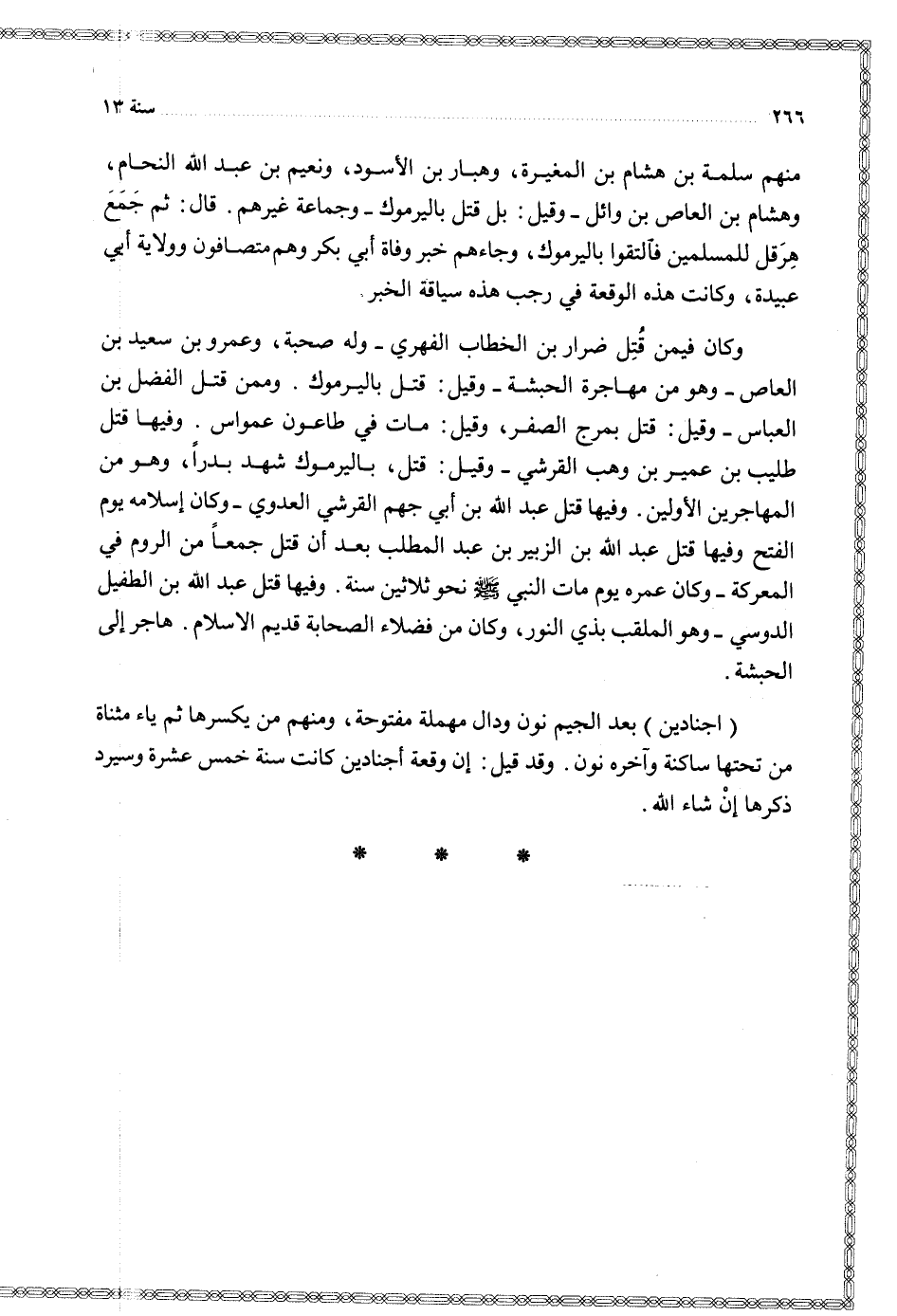 وكان فيمن قتل ضرار بن الخطاب الفهري وله صحبة وعمرو بن سعيد بن العاص وهو من مهاجرة الحبشة وقيل قتل باليرموك وممن قتل الفضل بن العباس وقيل قتل بمرج الصفر وقيل مات في طاعون عمواس وفيها قتل طليب بن عمير بن وهب القرشي وقيل قتل باليرموك شهد بدرا وهو من المهاجرين الأولين وفيها قتل عبد الله بن أبي جهم القرشي العدوي وكان إسلامه يوم الفتح وفيها قتل عبد الله بن الزبير بن عبد المطلب بعد أن قتل جمعا من الروم في المعركة وكان عمره يوم مات النبي نحو ثلاثين سنة وفيها قتل عبد الله بن الطفيل الدوسي وهو الملقب بذي النور وكان من فضلاء الصحابة قديم الإسلام هاجر إلى الحبشة