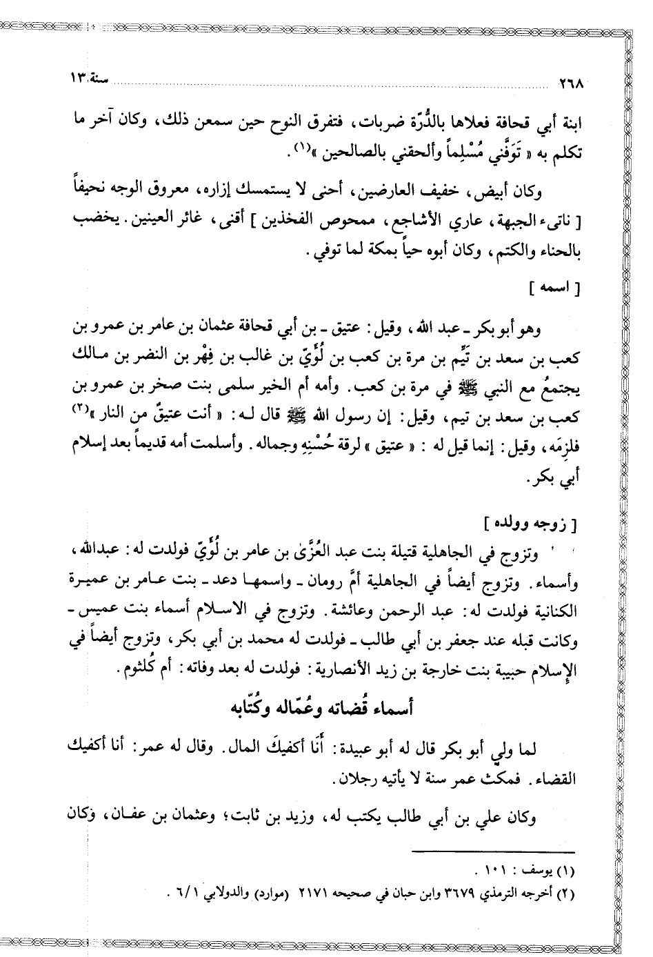 ابنة أبي قحافة فعلاها بالدرة ضربات فتفرق النوح حين سمعن ذلك وكان آخر ما تكلم به توفني مسلما و ألحقني بالصالحين