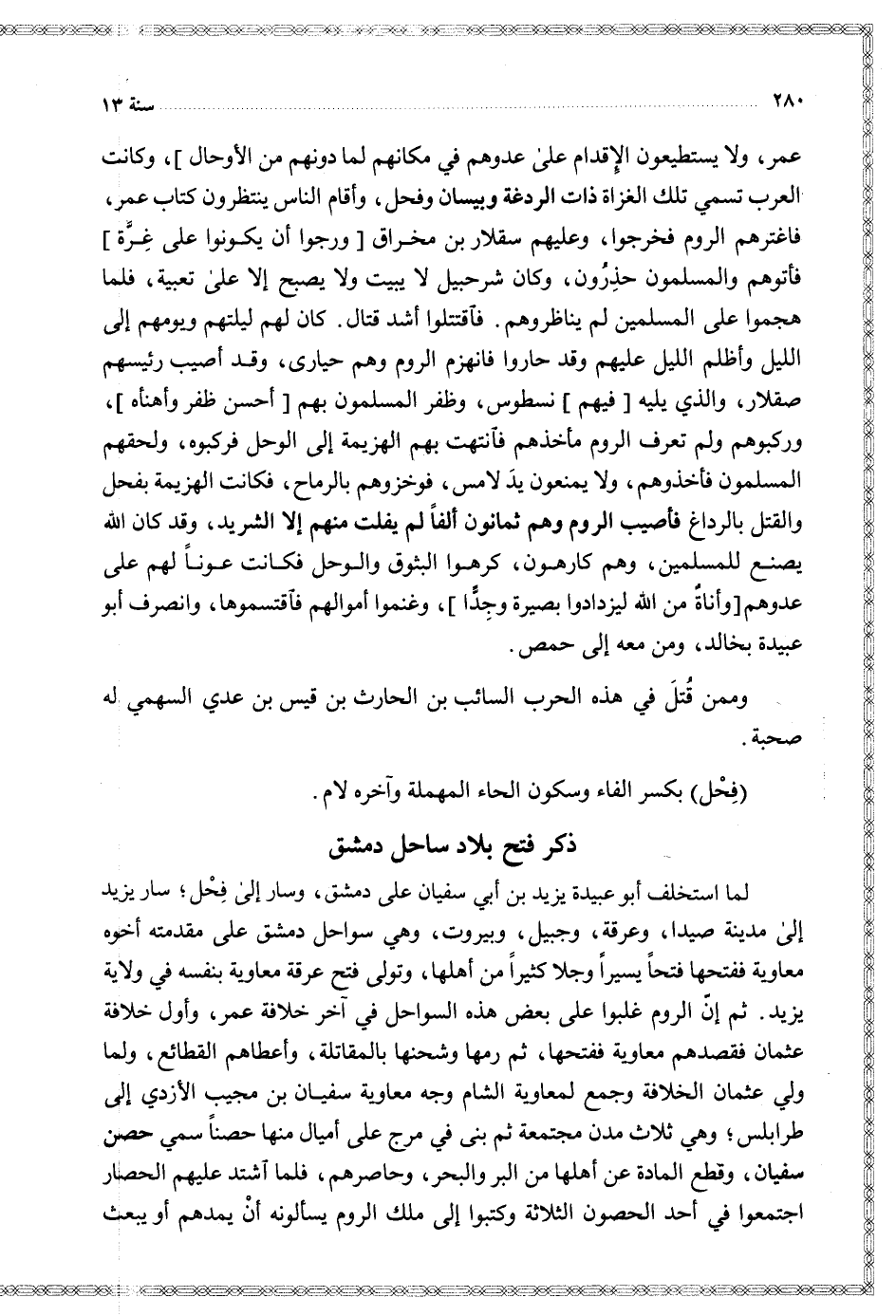 عمر ولا يستطيعون الإقدام على عدوهم في مكانهم لما دونهم من الأوحال وكانت العرب تسمي تلك الغزاة ذات الردغة وبيسان وفحل وأقام الناس ينتظرون كتاب عمر فاغترهم الروم فخرجوا وعليهم سقلار بن مخراق ورجوا أن يكونوا على غرة فأتوهم والمسلمون حذرون وكان شرحبيل لا يبيت ولا يصبح إلا على تعبية فلما هجموا على المسلمين لم يناظروهم فاقتتلوا أشد قتال كان لهم ليلتهم ويومهم إلى الليل وأظلم الليل عليهم وقد حاروا فانهزم الروم وهم حيارى وقد أصيب رئيسهم صقلار والذي يليه فيهم نسطوس وظفر المسلمون بهم أحسن ظفر وأهنأه وركبوهم ولم تعرف الروم مأخذهم فانتهت بهم الهزيمة إلى الوحل فركبوه ولحقهم المسلمون فأخذوهم ولا يمنعون يد لامس فوخزوهم بالرماح فكانت الهزيمة بفحل والقتل بالرداغ فأصيب الروم وهم ثمانون ألفا لم يفلت منهم إلا الشريد وقد كان الله يصنع للمسلمين وهم كارهون كرهوا البثوق والوحل فكانت عونا لهم على عدوهم واناة من الله ليزدادوا بصيرة وجدا وغنموا أموالهم فاقتسموها وانصرف أبو عبيدة بخالد ومن معه إلى حمص