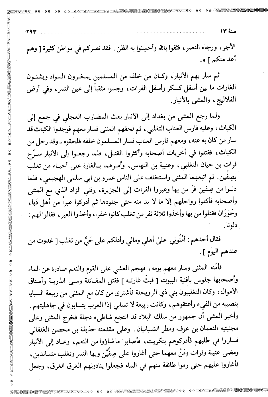 فأمنه المثنى وسار معهم يومه فهجم العشي على القوم والنعم صادرة عن الماء وأصحابها جلوس بأفنية البيوت فبث غارته فقتل المقاتلة وسبى الذرية واستاق الأموال وكان التغلبيون بني ذي الرويحلة فاشترى من كان مع المثنى من ربيعة السبايا بنصيبه من الفيء وأعتقوهم وكانت ربيعة لا تسابي إذا العرب يتسابون في جاهليتهم وأخبر المثنى أن جمهور من سلك البلاد قد انتجع شاطئ دجلة فخرج المثنى وعلى مجنبتيه النعمان بن عوف ومطر الشيبانيان وعلى مقدمته حذيفة بن محصن الغلفاني فساروا في طلبهم فأدركوهم بتكريت فأصابوا ما شاؤوا من النعم وعاد إلى الأنبار ومضى عتيبة وفرات ومن معهما حتى أغاروا على صفين وبها النمر وتغلب متساندين فأغاروا عليهم حتى رموا طائفة منهم في الماء فجعلوا ينادونهم الغرق الغرق وجعل