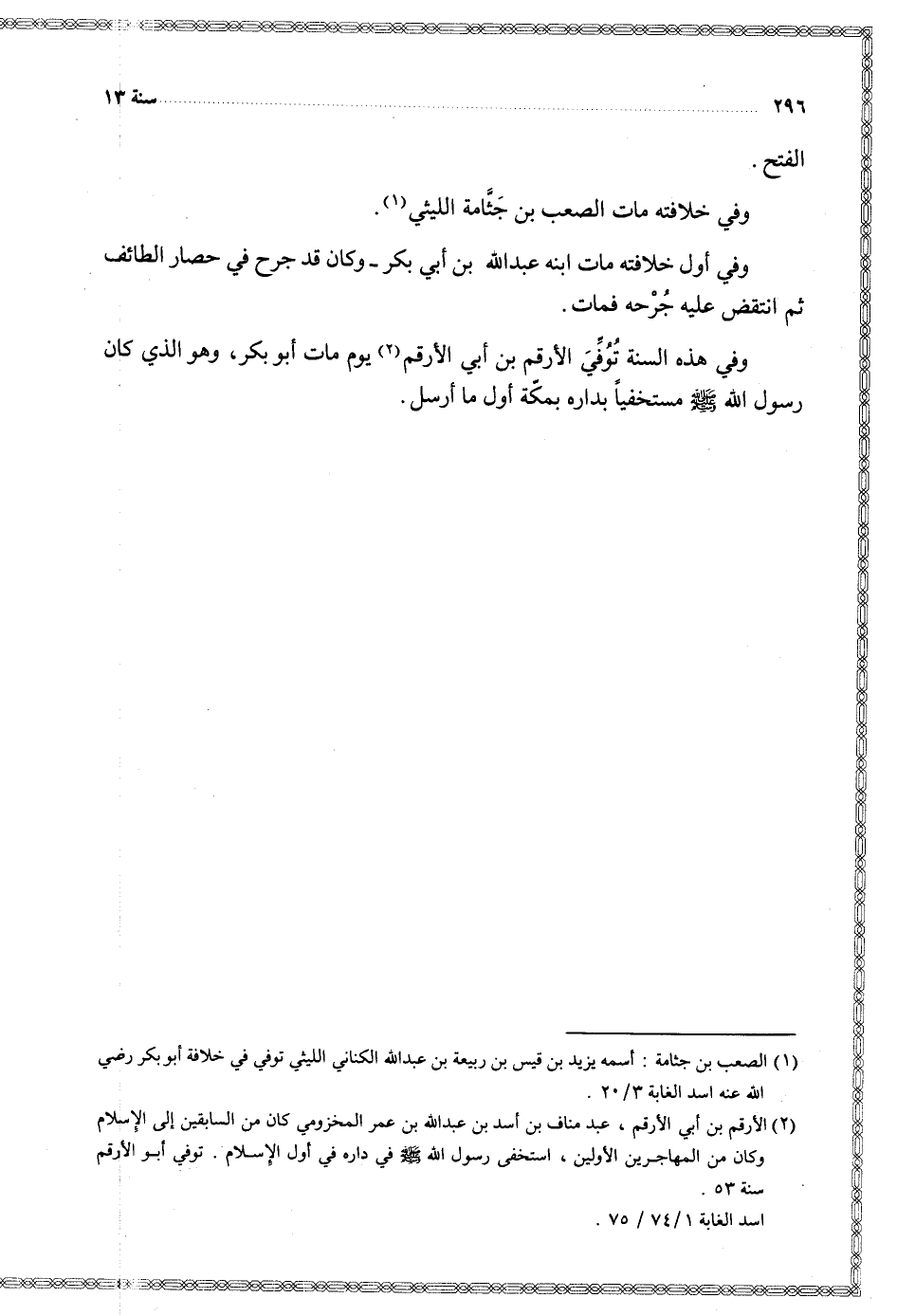 وفي هذه السنة توفي الأرقم بن أبي الأرقم يوم مات أبو بكر وهو الذي كان رسول الله مستخفيا بداره بمكة أول ما أرسل