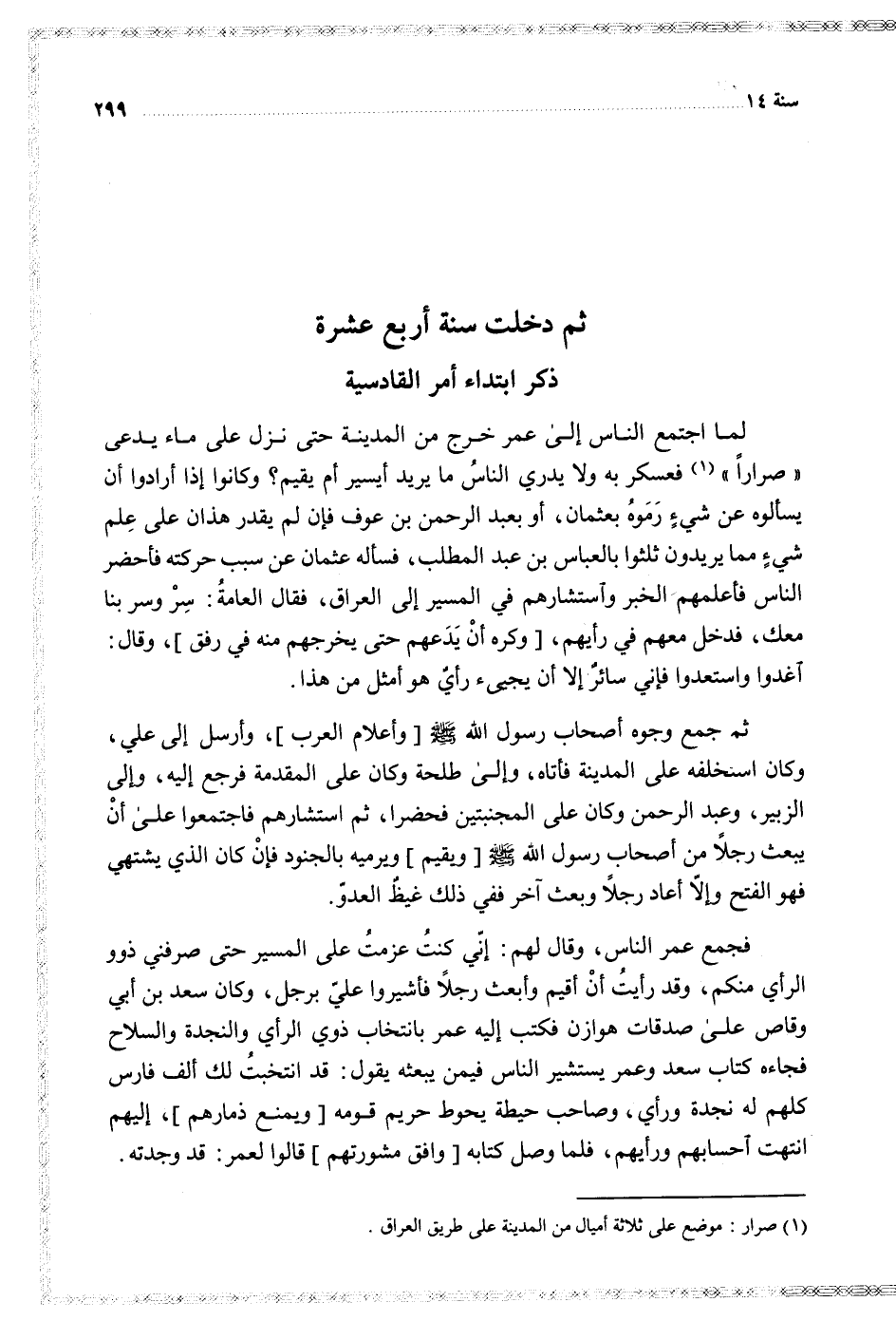 لما اجتمع الناس إلى عمر خرج من المدينة حتى نزل على ماء يدعى صرارا فعسكر به ولا يدري الناس ما يريد أيسير أم يقيم وكانوا إذا أرادوا أن يسألوه عن شيء رموه بعثمان أو بعبد الرحمن بن عوف فإن لم يقدر هذان على علم شيء مما يريدون ثلثوا بالعباس بن عبد المطلب فسأله عثمان عن سبب حركته فأحضر الناس فأعلمهم الخبر واستشارهم في المسير إلى العراق فقال العامة سر وسر بنا معك فدخل معهم في رأيهم وكره أن يدعهم حتى يخرجهم منه في رفق وقال اغدوا واستعدوا فإني سائر إلا أن يجيء رأي هو أمثل من هذا