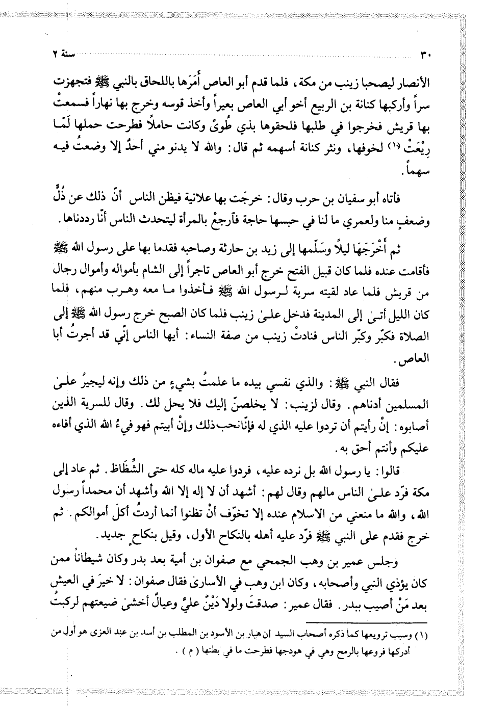 الأنصار ليصحبا زينب من مكة فلما قدم أبو العاص أمرها باللحاق بالنبي فتجهزت سرا وأركبها كنانة بن الربيع أخو أبي العاص بعيرا وأخذ قوسه وخرج بها نهارا فسمعت بها قريش فخرجوا في طلبها فلحقوها بذي طوى وكانت حاملا فطرحت حملها لما ريعت لخوفها ونثر كنانة أسهمه ثم قال والله لا يدنو مني أحد إلا وضعت فيه سهما