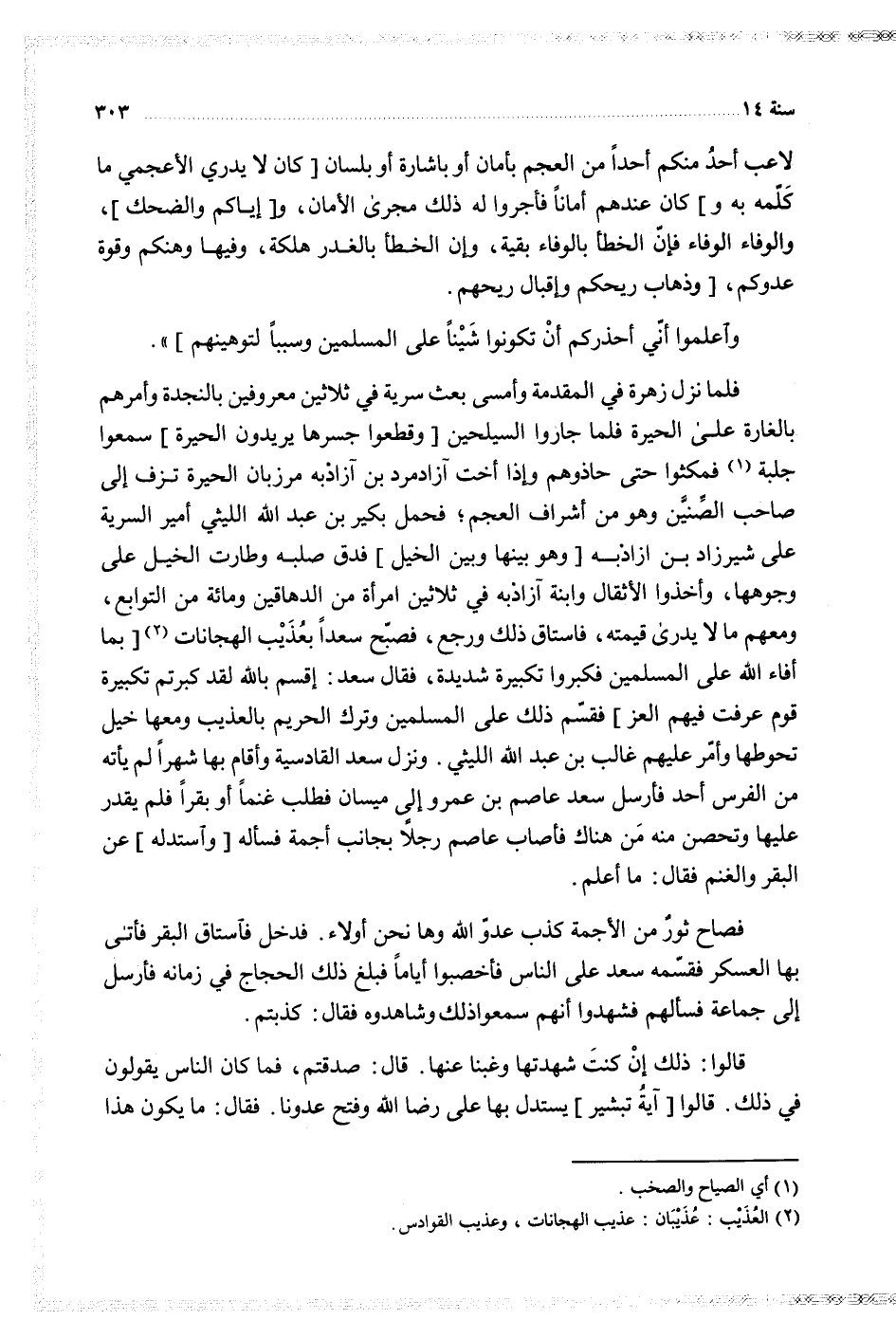 فلما نزل زهرة في المقدمة وأمسى بعث سرية في ثلاثين معروفين بالنجدة وأمرهم بالغارة على الحيرة فلما جاروا السيلحين وقطعوا جسرها يريدون الحيرة سمعوا جلبة فمكثوا حتى حاذوهم وإذا أخت آزادمرد بن آزاذبه مرزبان الحيرة تزف إلى صاحب الصنين وهو من أشراف العجم فحمل بكير بن عبد الله الليثي أمير السرية على شيرزاد بن آزاذبه وهو بينها وبين الخيل فدق صلبه وطارت الخيل على وجوهها وأخذوا الأثقال وابنة آزاذبه في ثلاثين امرأة من الدهاقين ومائة من التوابع ومعهم ما لا يدرى قيمته فاستاق ذلك ورجع فصبح سعدا بعذيب الهجانات بما أفاء الله على المسلمين فكبروا تكبيرة شديدة فقال سعد أقسم بالله لقد كبرتم تكبيرة قوم عرفت فيهم العز فقسم ذلك على المسلمين وترك الحريم بالعذيب ومعها خيل تحوطها وأمر عليهم غالب بن عبد الله الليثي ونزل سعد القادسية وأقام بها شهرا لم يأته من الفرس أحد فأرسل سعد عاصم بن عمرو إلى ميسان فطلب غنما أو بقرا فلم يقدر عليها وتحصن منه من هناك فأصاب عاصم رجلا بجانب أجمة فسأله واستدله عن البقر والغنم فقال ما أعلم