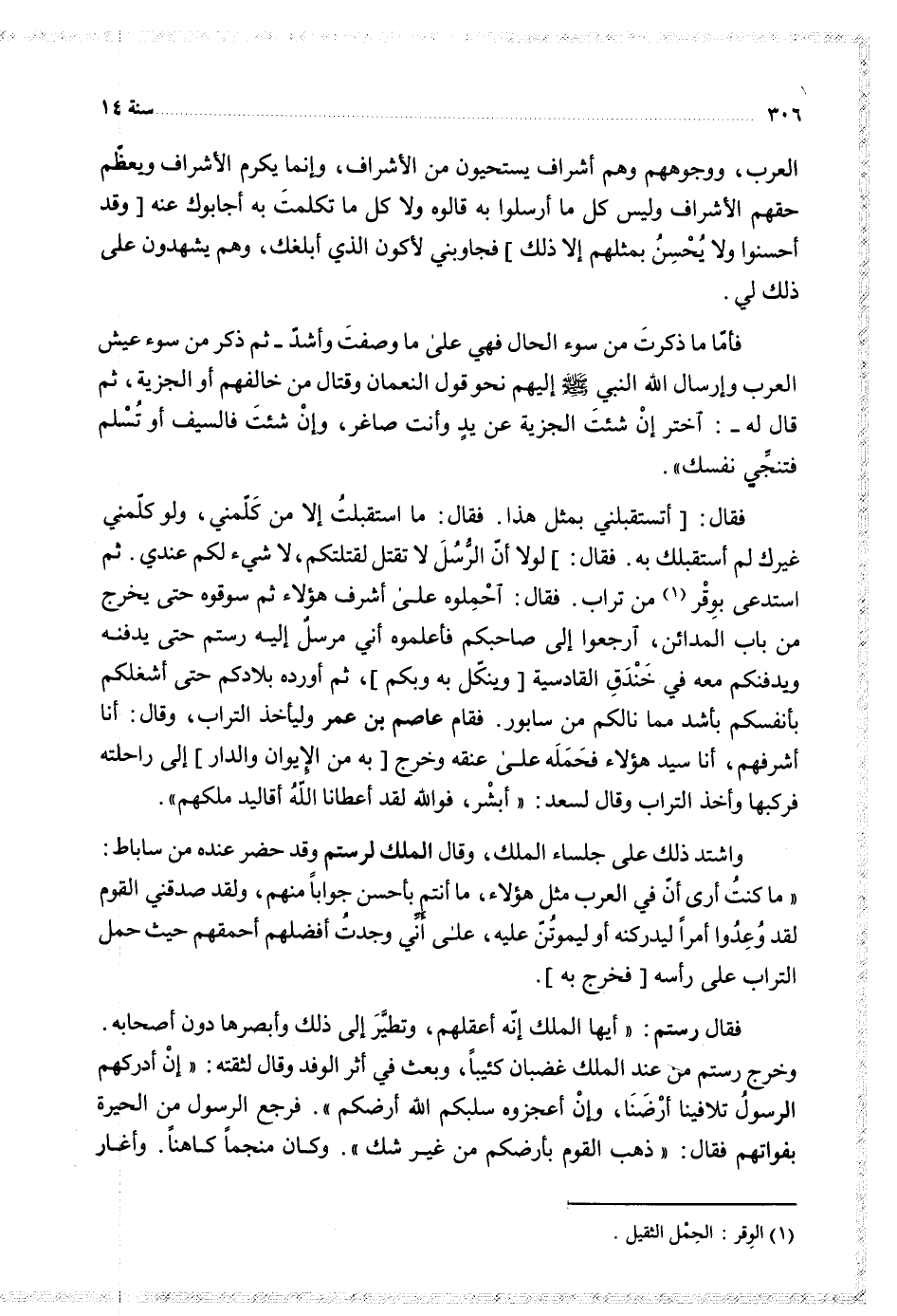 فقال أتستقبلني بمثل هذا فقال ما استقبلت إلا من كلمني ولو كلمني غيرك لم أستقبلك به فقال لولا أن الرسل لا تقتل لقتلتكم لا شيء لكم عندي ثم استدعى بوقر من تراب فقال احملوه على أشرف هؤلاء ثم سوقوه حتى يخرج من باب المدائن ارجعوا إلى صاحبكم فأعلموه أني مرسل إليه رستم حتى يدفنه ويدفنكم معه في خندق القادسية وينكل به وبكم ثم أورده بلادكم حتى أشغلكم بأنفسكم بأشد مما نالكم من سابور فقام عاصم بن عمر وليأخذ التراب وقال أنا أشرفهم أنا سيد هؤلاء فحمله على عنقه وخرج به من الإيوان والدار إلى راحلته فركبها وأخذ التراب وقال لسعد أبشر فوالله لقد أعطانا الله أقاليد ملكهم