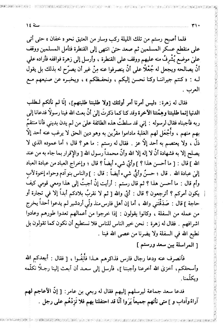 فقال له زهرة ليس أمرنا أمر أولئك ولا طلبتنا طلبتهم إنا لم نأتكم لطلب الدنيا إنما طلبتنا وهمتنا الآخرة وقد كنا كما ذكرت إلى أن بعث الله فينا رسولا فدعانا إلى ربه فأجبناه فقال لرسوله إني قد سلطت هذه الطائفة على من لم يدن بديني فأنا منتقم بهم منهم وأجعل لهم الغلبة ما داموا مقرين به وهو دين الحق لا يرغب عنه أحد إلا ذل ولا يعتصم به أحد إلا عز فقال له رستم ما هو قال أما عموده الذي لا يصلح إلا به فشهادة أن لا إله إلا الله وأن محمدا رسول الله والإقرار بما جاء به من عند الله قال ما أحسن هذا وأي شيء أيضا قال وإخراج العباد من عبادة العباد إلى عبادة الله قال حسن وأي شيء أيضا قال والناس بنو آدم وحواء أخوة لأب وأم قال ما أحسن هذا ثم قال رستم أرأيت إن أجبت إلى هذا ومعي قومي كيف يكون أمركم أترجعون قال أي والله ثم لا نقرب بلادكم أبدا إلا في تجارة أو حاجة قال صدقتني والله إما ن أهل فارس منذ ولي أردشير لم يدعوا أحدا يخرج من عمله من السفلة وكانوا يقولون إذا خرجوا من أعمالهم تعدوا طورهم وعادوا أشرافهم فقال له زهرة نحن خير الناس للناس فلا نستطيع أن نكون كما تقولون بل نطيع الله في السفلة ولا يضرنا من عصى الله فينا $ المراسلة بين سعد ورستم $