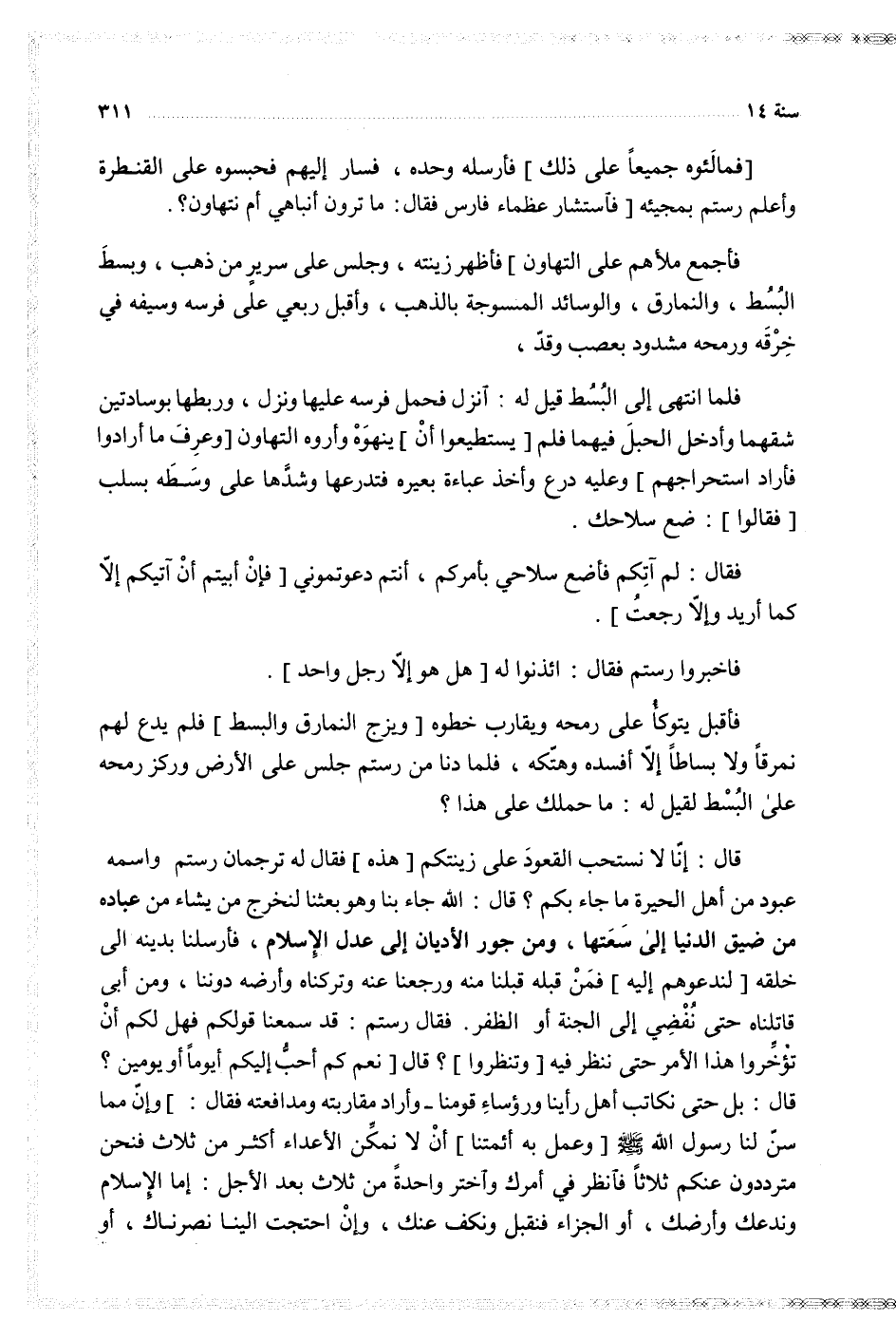 قال إنا لا نستحب القعود على زينتكم هذه فقال له ترجمان رستم واسمه عبود من أهل الحيرة ما جاء بكم قال الله جاء بنا وهو بعثنا لنخرج من يشاء من عباده من ضيق الدنيا إلى سعتها ومن جور الأديان إلى عدل الإسلام فأرسلنا بدينه إلى خلقه لندعوهم إليه فمن قبله قبلنا منه ورجعنا عنه وتركناه وأرضه دوننا ومن أبى قاتلناه حتى نفضي إلى الجنة أو الظفر فقال رستم قد سمعنا قولكم فهل لكم أن تؤخروا هذا الأمر حتى ننظر فيه وتنظروا قال نعم كم أحب إليكم أيوما أو يومين قال بل حتى نكاتب أهل رأينا ورؤساء قومنا وأراد مقاربته ومدافعته فقال وإن مما سن لنا رسول الله وعمل به أئمتنا أن لا نمكن الأعداء أكثر من ثلاث فنحن مترددون عنكم ثلاثا فانظر في أمرك واختر واحدة من ثلاث بعد الأجل إما الإسلام وندعك وأرضك أو الجزاء فنقبل ونكف عنك وإن احتجت إلينا نصرناك أو